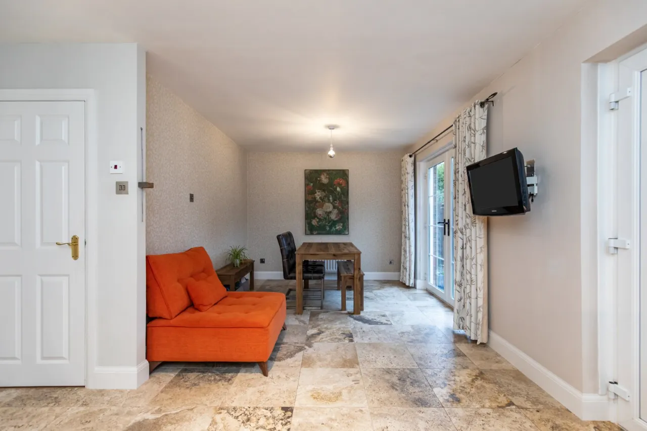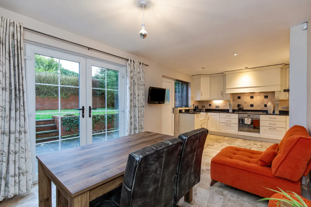 Range of high and low level shaker style units, granite work surfaces and upstands, ceramic inset sink unit with mixer taps, integrated fridge and freezer, integrated electric oven, 3 ring gas hob and electric grill pad, concealed extractor fan, ceramic tiled floor, composite door to patio and garden. Ample space for dining or living.