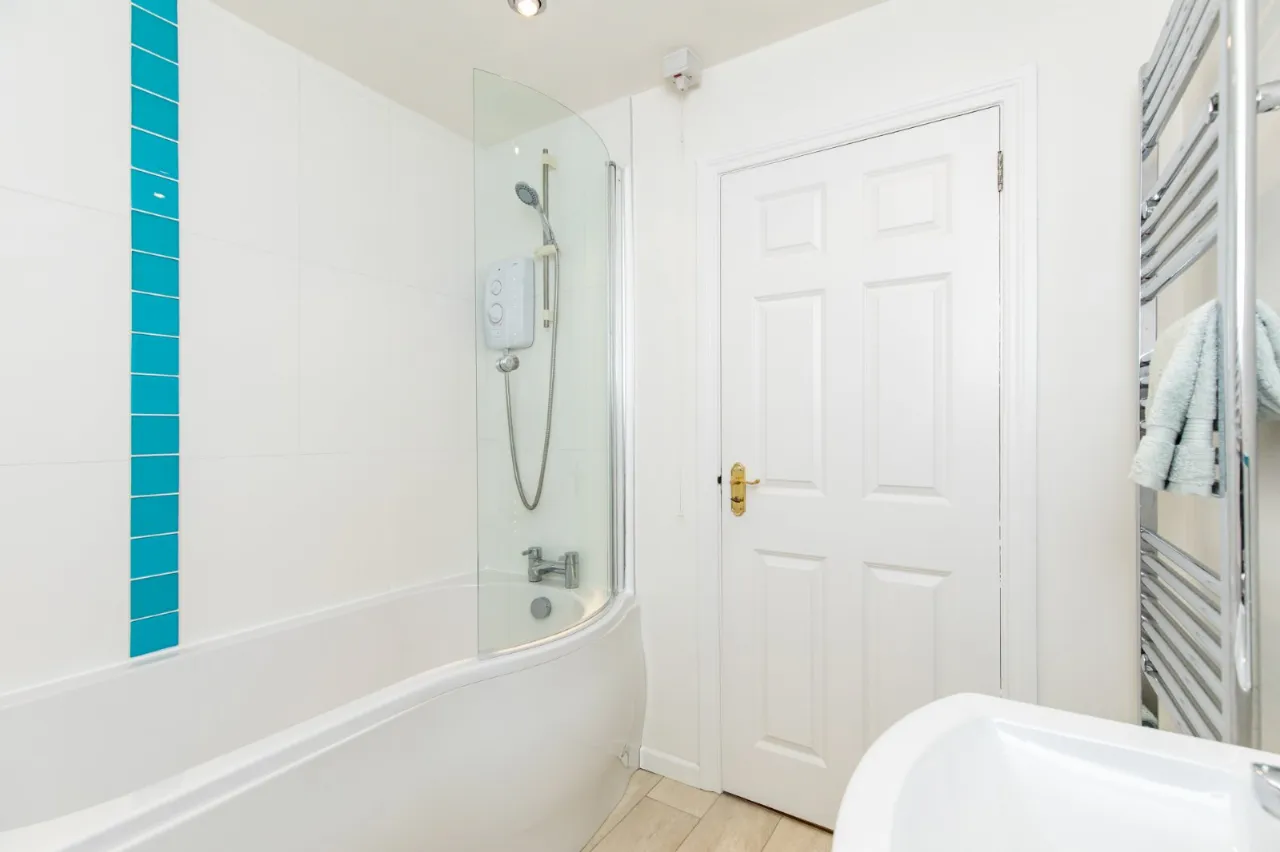White suite comprising: Shower bath with electric shower over, glass shower screen, low flush WC, pedestal wash hand basin with chrome mixer taps and splashback, ceramic tiled floor, partly tiled walls, extractor fan.
