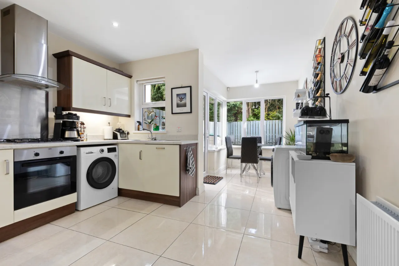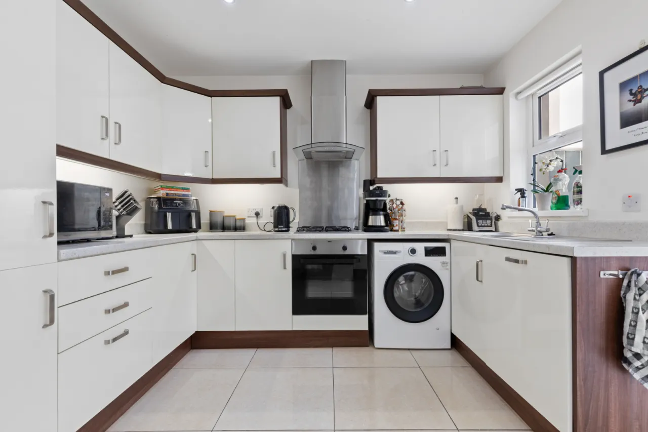 Excellent range of high and low level units, laminate work surfaces, single drainer stainless steel 1 1/4 bowl sink unit with chrome mixer taps. Integrated electric under oven, 4 ring gas hob, stainless steel splashback, extractor fan, integrated fridge and freezer, plumbed for washing machine, ceramic tiled floor, integrated dishwasher, low voltage spotlights, uPVC double glazed door to enclosed rear garden.
