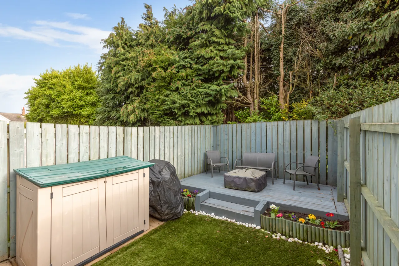 Fully enclosed, low maintenance rear garden with artificial grass and raised decked patio area, outside tap, outside light.
