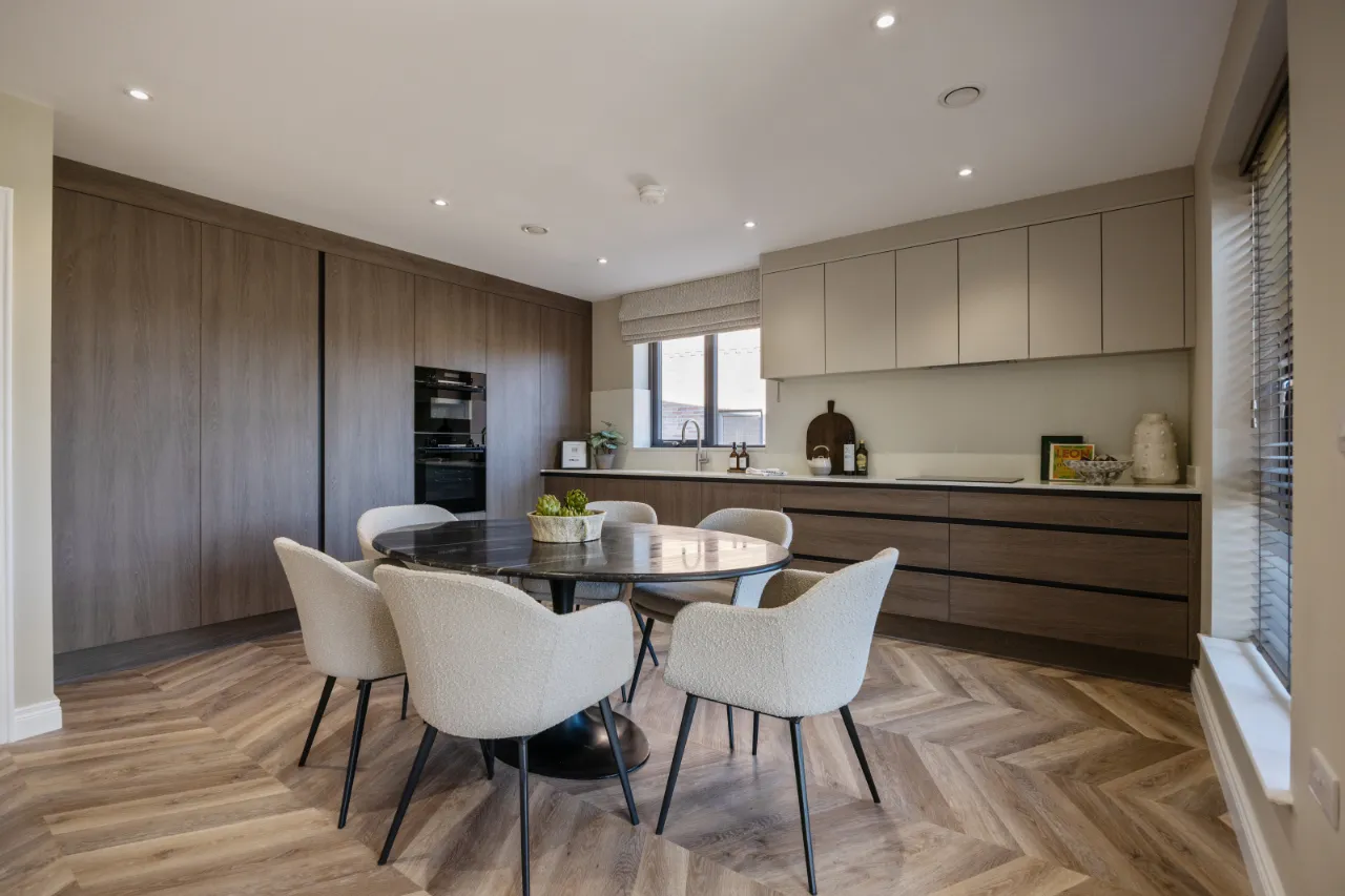 Quality units with choice of traditional / contemporary doors with a range of colours and stainless steel handlesQuartz worktop with upstandSoft closing drawers and doorsIntegrated appliances to include ceramic hob, high level single oven, microwave combi, fridge/freezer and dishwasherContemporary chrome monoblock tap. Quooker Tap in detached homes.1.5 low profile stainless steel sink