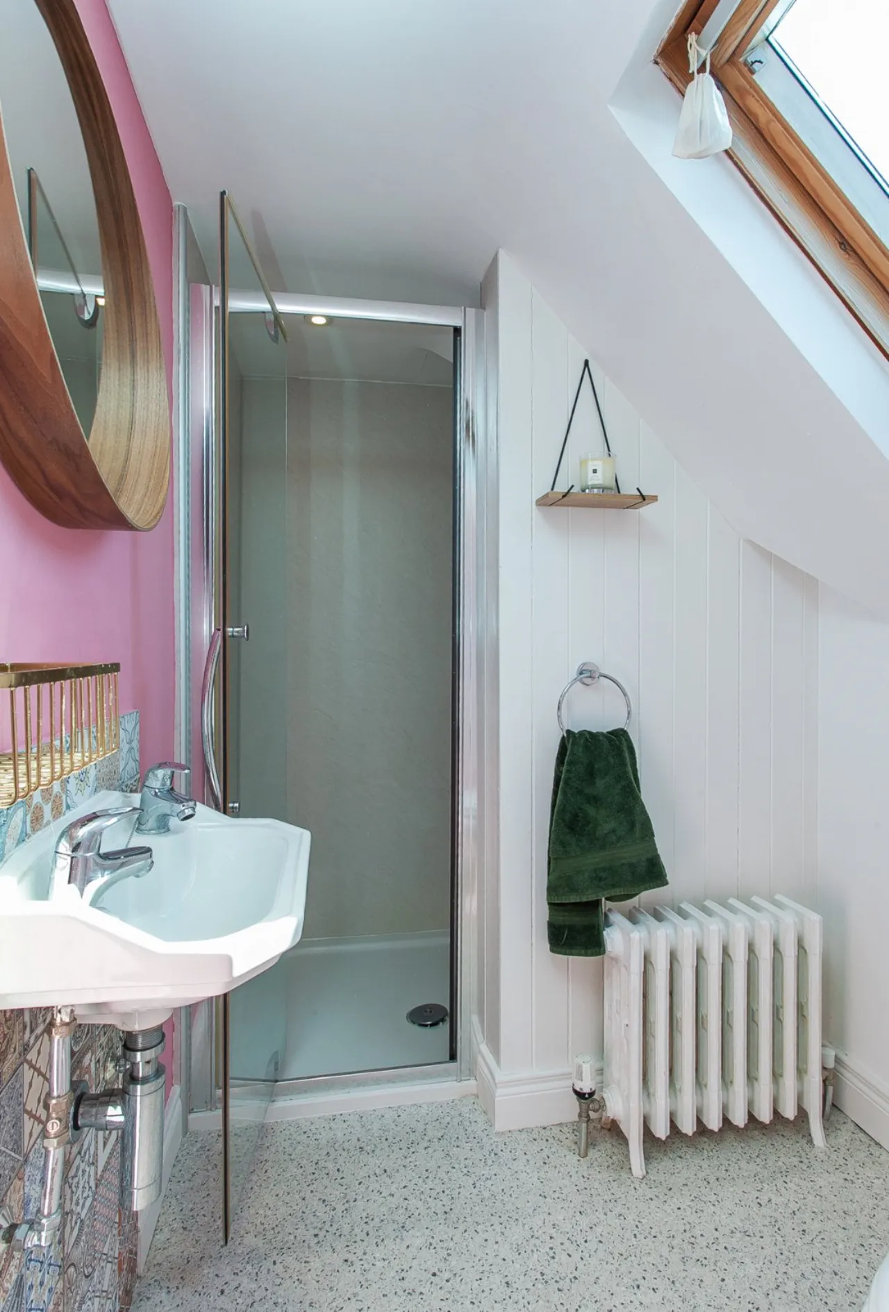 Fully panelled shower enclosure, Low flush WC. Wash hand basin. Hotpress.