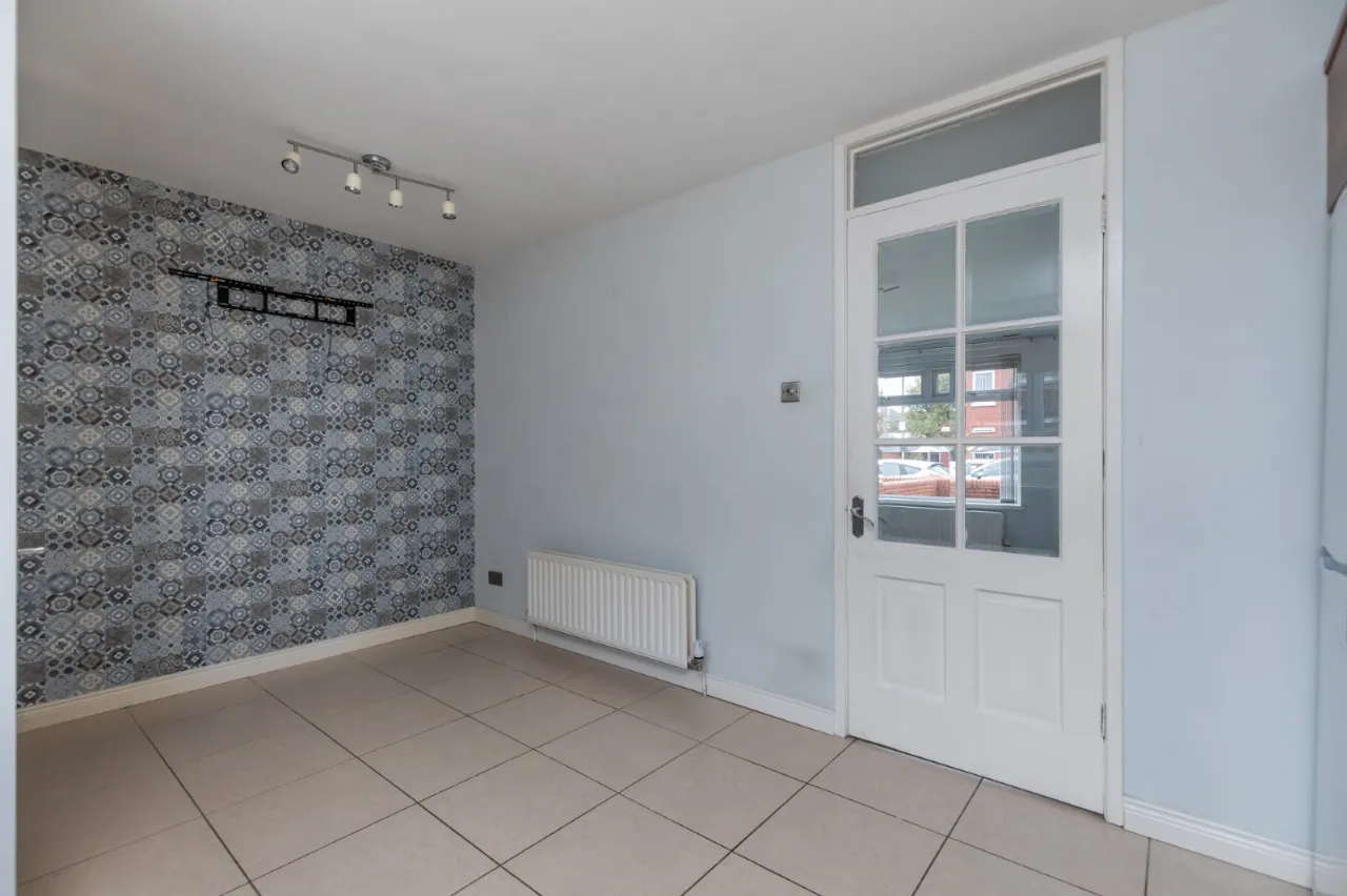 Range of high and low level units, laminate work surface with stainless steel sink unit and drainer, 1.5 tub with mixer tap. Integrated oven, four ring electric hob, stainless steel kitchen splash back with stainless steel extractor above, space for fridge freezer, plumbed for washing machine, space for tumble dryer, tiled flooring, open to dining area, access to rear hall.