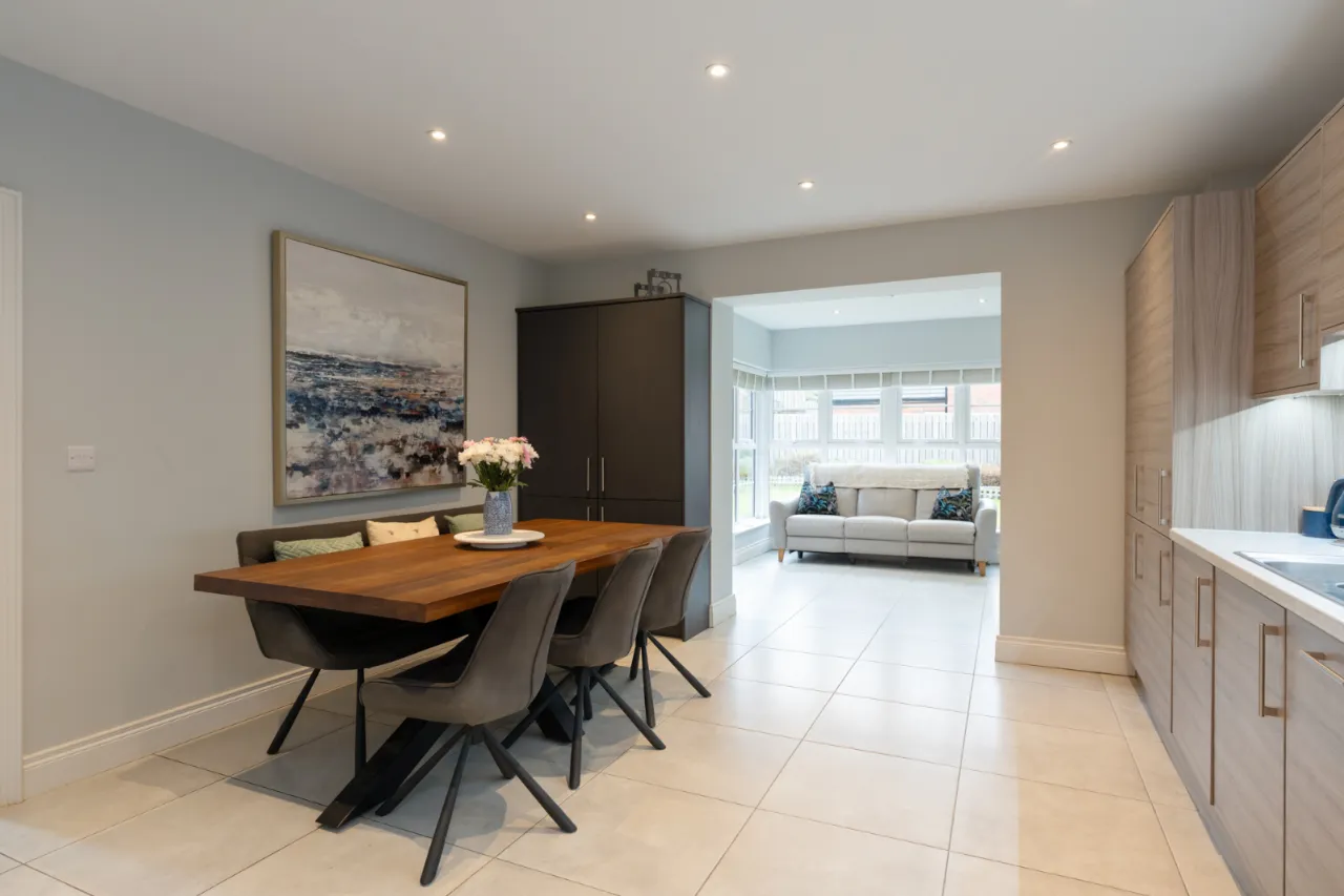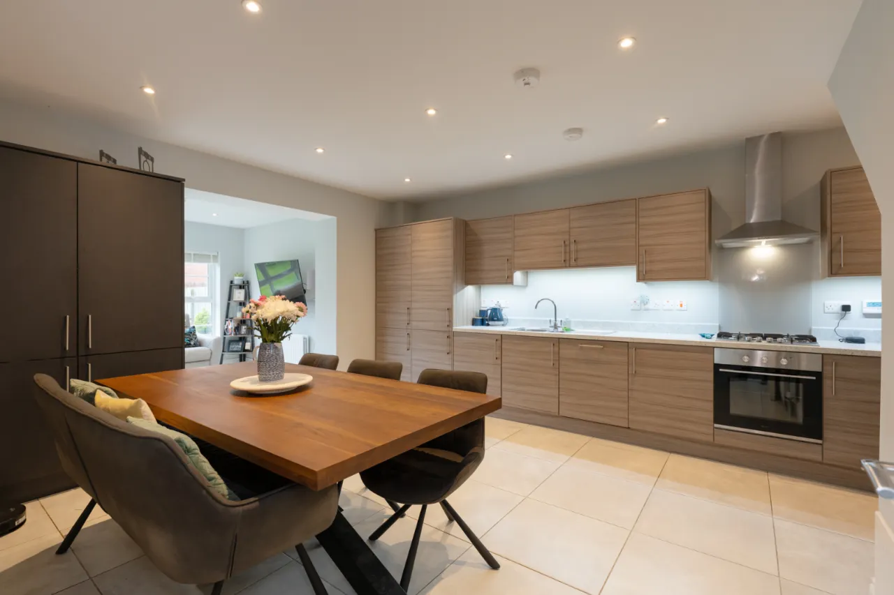 Fantastic range of high and low level units, laminate work surfaces, stainless steel sink unit and drainer 1.5 tub with mixer tap, integrated oven, four ring gas hob, glass kitchen splash back, stainless steel extractor fan, integrated fridge freezer, integrated dish washer, integrated washer drier, gas fired central heating boiler, tiled flooring, recessed spotlighting, open to dining area, leading through to sunroom