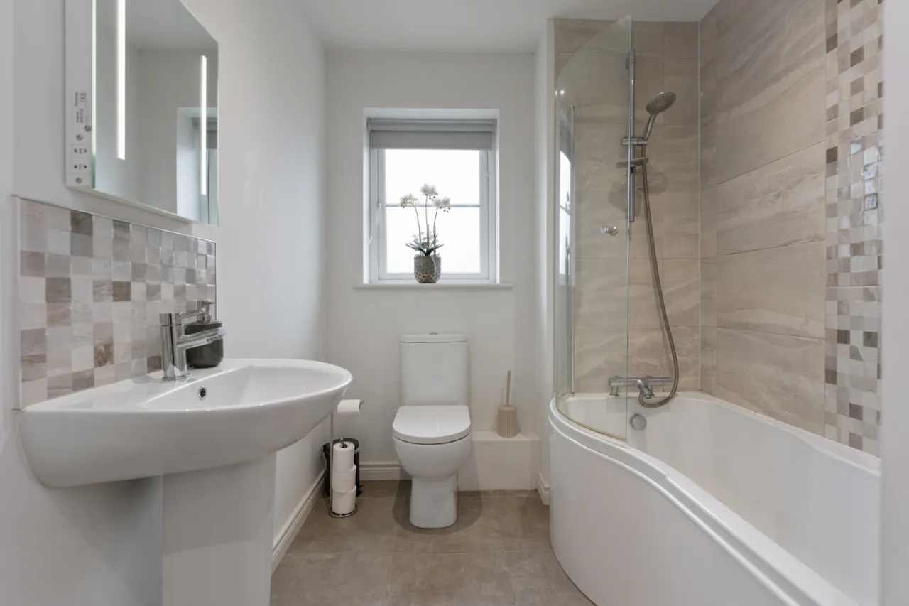 White suite comprising of low flush WC, pedestal was hand basin with mixer tap, tiled splash back, paneled bath with hot and cold tap and handset, partly tiled walls, tiled flooring, recessed spotlighting, extractor fan, vertical chrome heated towel rail.