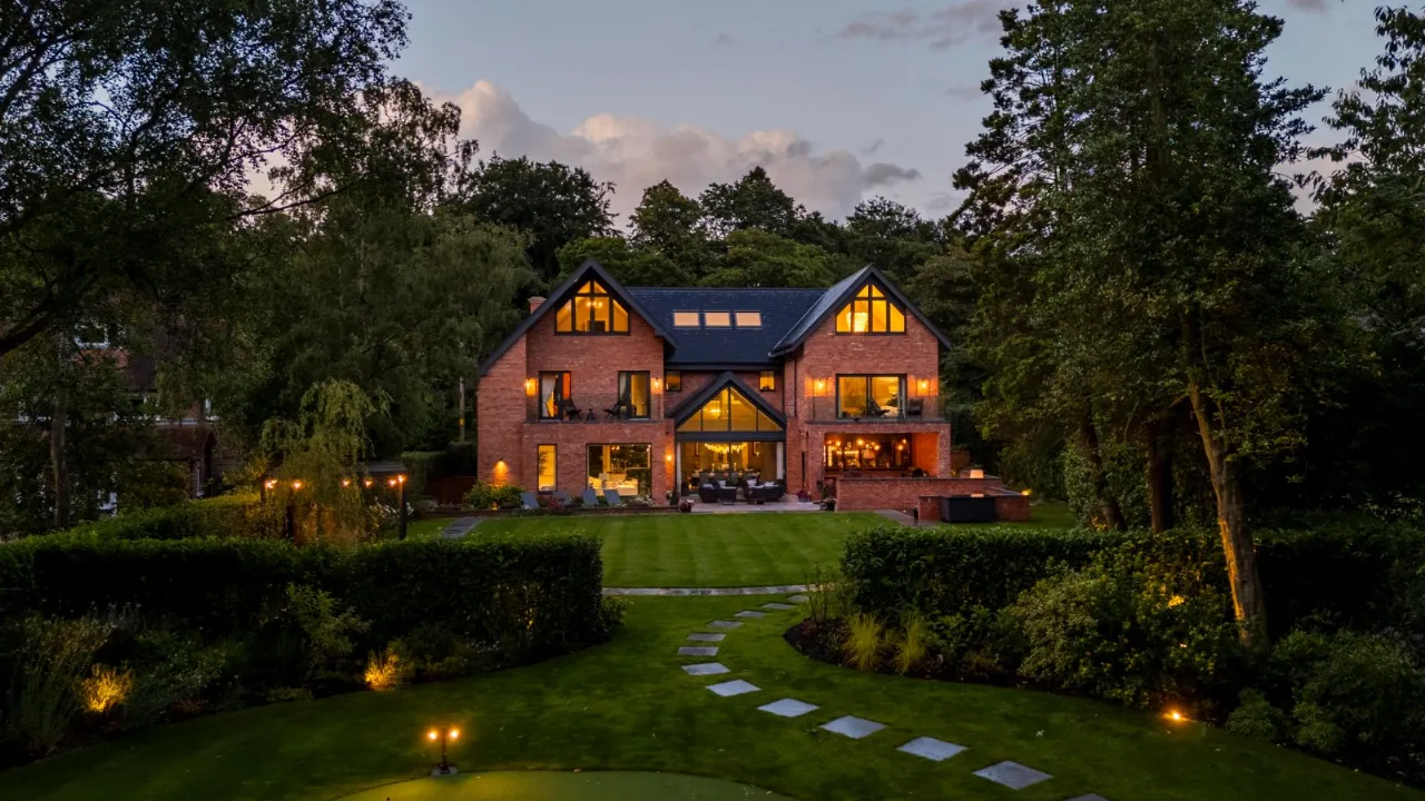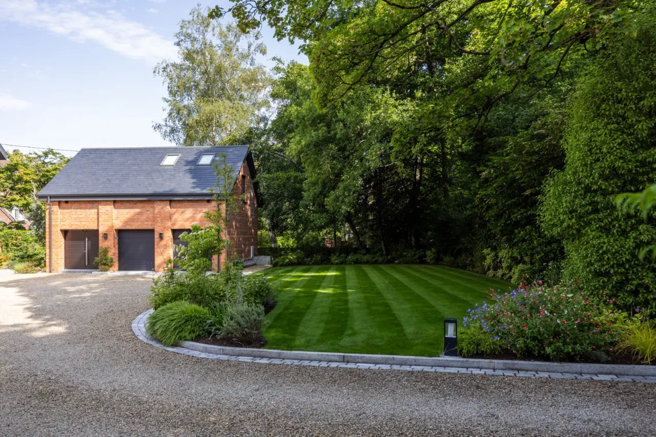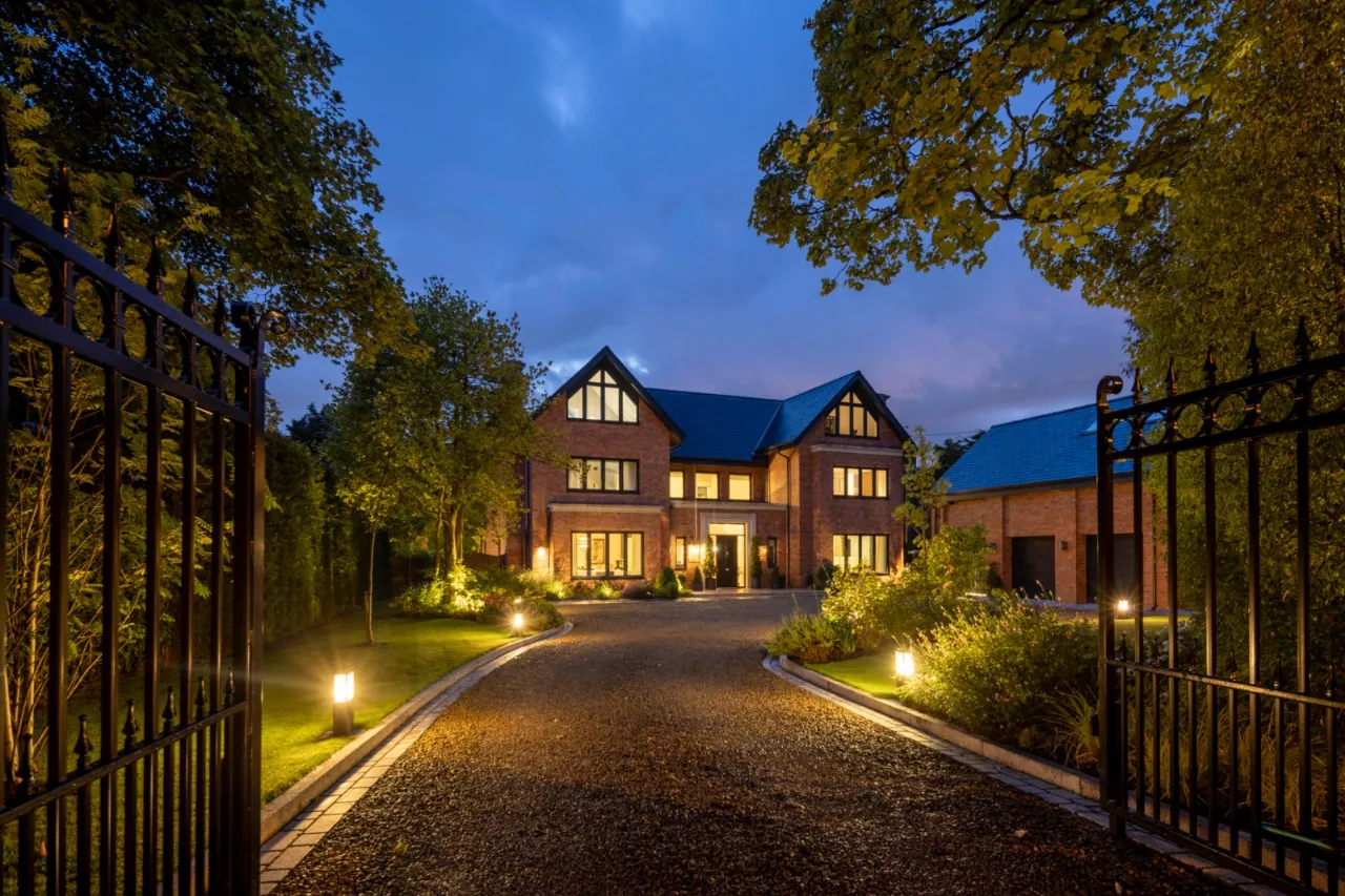 Granite tiles with access points to left and right of front driveway, wide enough for car and trailer down left hand side with double entrance gates, footlighting, mature hedging and stoned garden areas which leads to a large back terrace which has a fantastic entertaining space off the kitchen. Sliding door that opens to outside living room with lighting, fully glazed gas fire overlooking rear gardens and there is also an enclosed BBQ area leading to concertina windows that lead into entertaining area inside. Plumbed for sink, water provision, large built in area for BBQ, gas fire, outside lighting, outside speakers which leads into party room inside. Outside dining space with footlighting, built in half wall with power points. Sun areas in front of the living/dining/kitchen. Steps up to large level lawn which has easy access to hot tub with built in speakers and footlighting. Surrounding the lawn are colourful flowerbeds, specimen trees and hedges which gives privacy. Properly treated grass. Pathway amongst the lawn leading to all weather astroturf. Lighting amongst trees leading to wellness centre/home office with wood effect floor, sliding doors to front and window to side, heating, power door to low flush wc, glazed door leading to sauna overlooking rear gardens and putting green. Garden tool shed / storage to the rear.