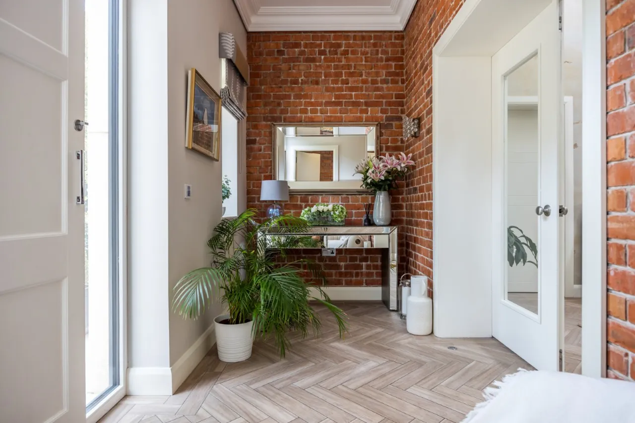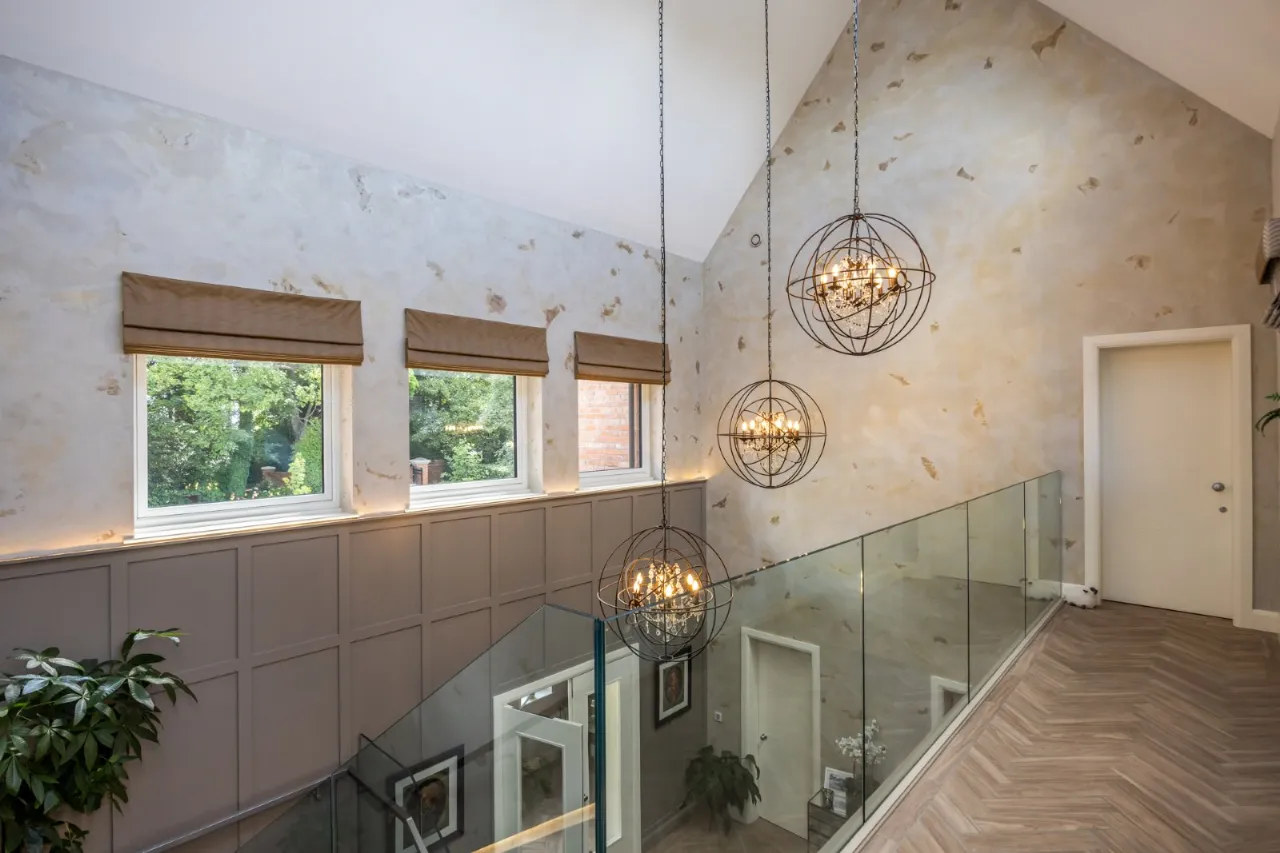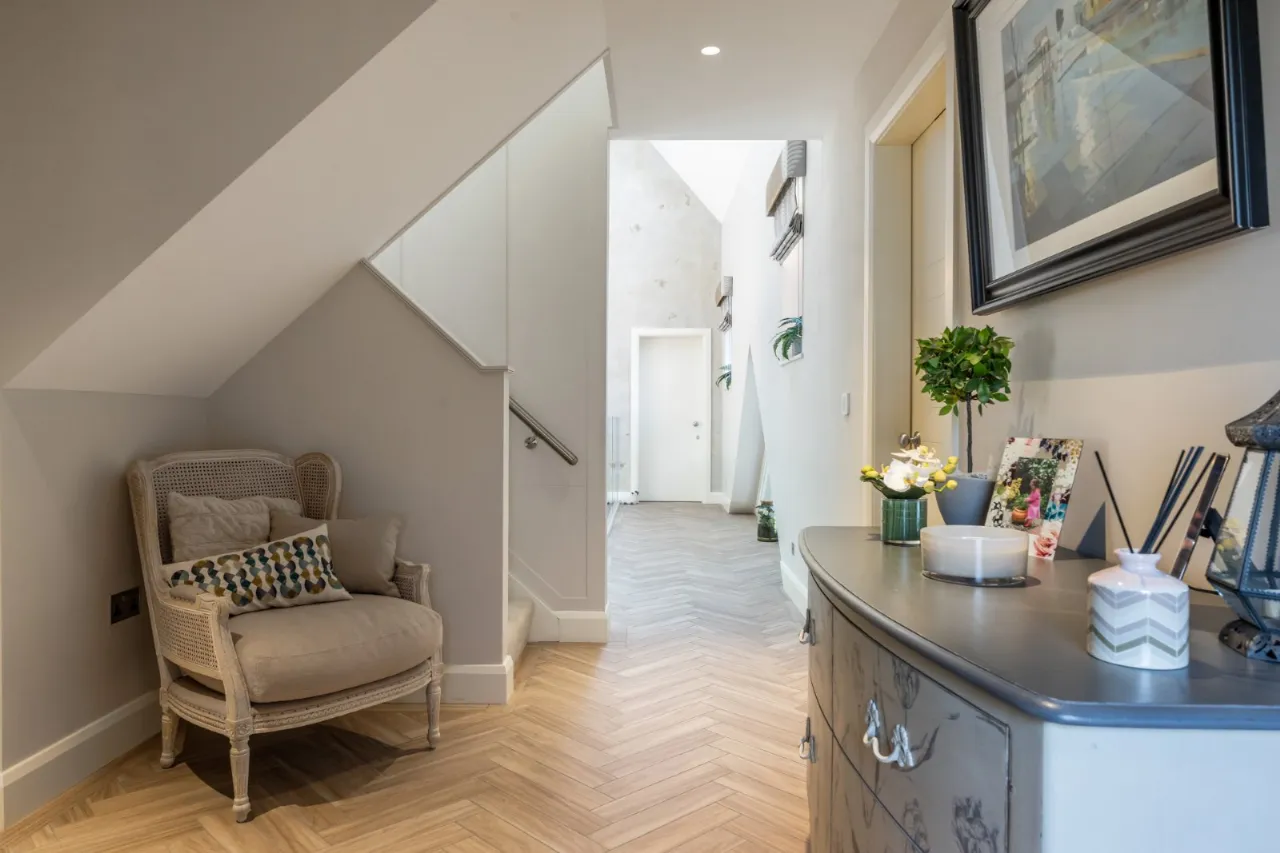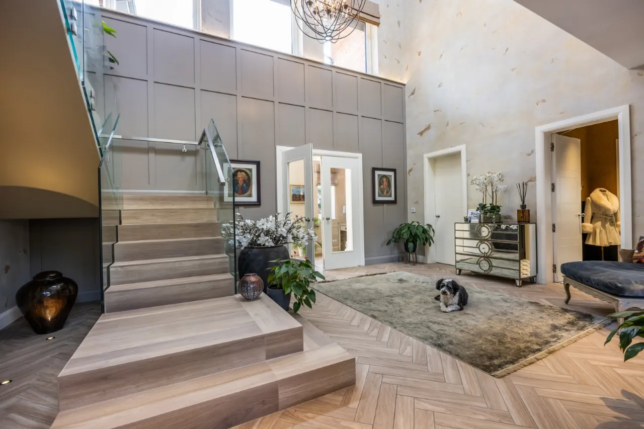 Beautiful reception hallway with parquet wood effect tiled floor, underfloor heating, Venetian plaster walls with feature panelling. Wood panel pocket doors leading to rear of the house with a through gas fire which also extends into the living/kitchen/dining room. Glazed balustrade with stainless steel handrail tiled stairwell leading to first floor. Triple height ceiling with windows, Venetian plaster walls, feature lighting and triple Velux windows. Door to:
