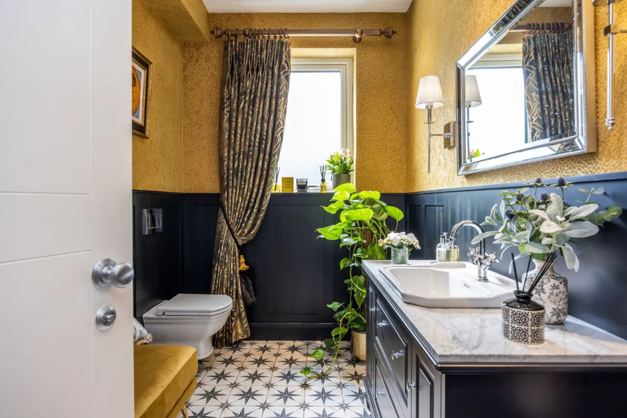 Three built in wardrobes, beautiful tiled floor, low flush wc with concealed cistern, Rocca wash hand basin with built in storage, feature wall lights and window to side.