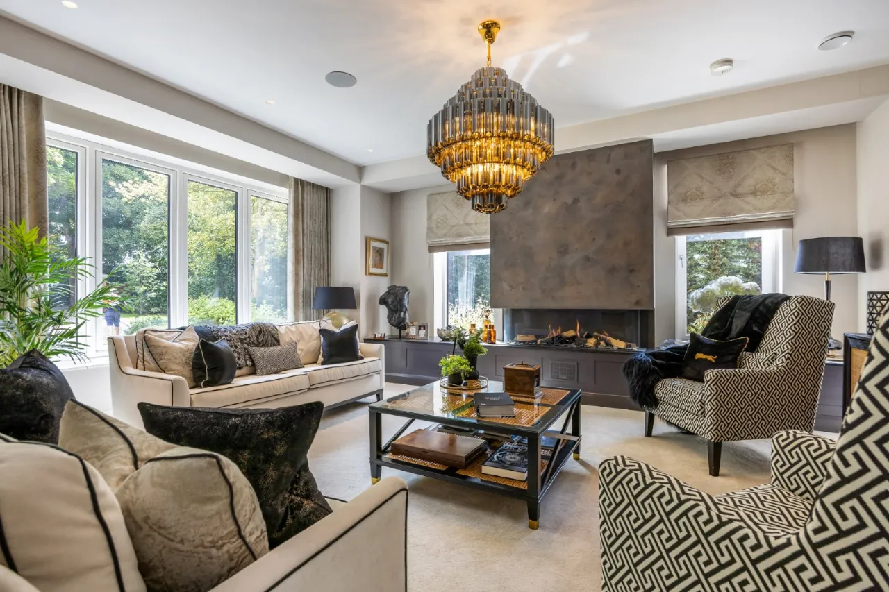Windows to front and two windows to each side of the central fireplace with long gas fire with polished granite worktop and built in sideboard. Windows to front with concealed pelmet, curtains and feature lighting, wired for Sonos.