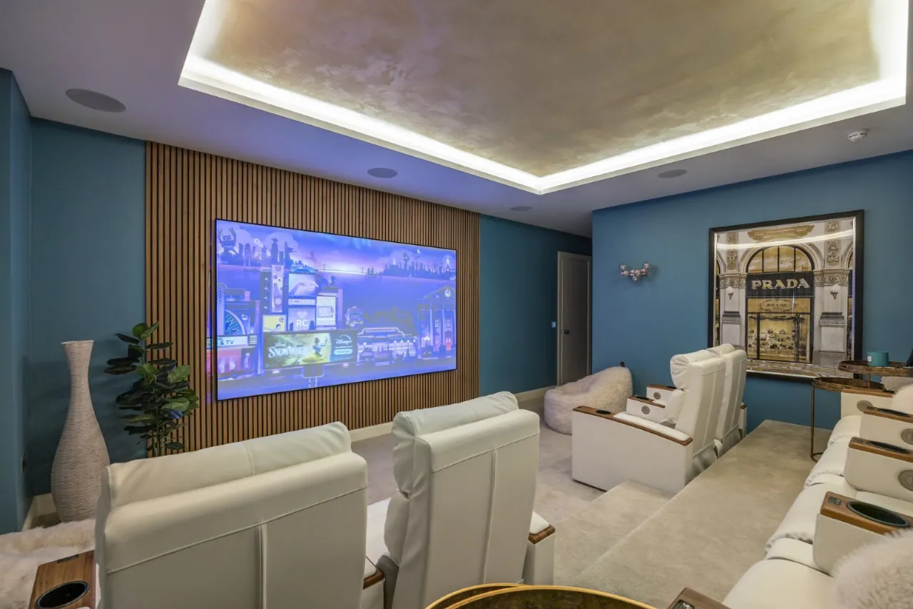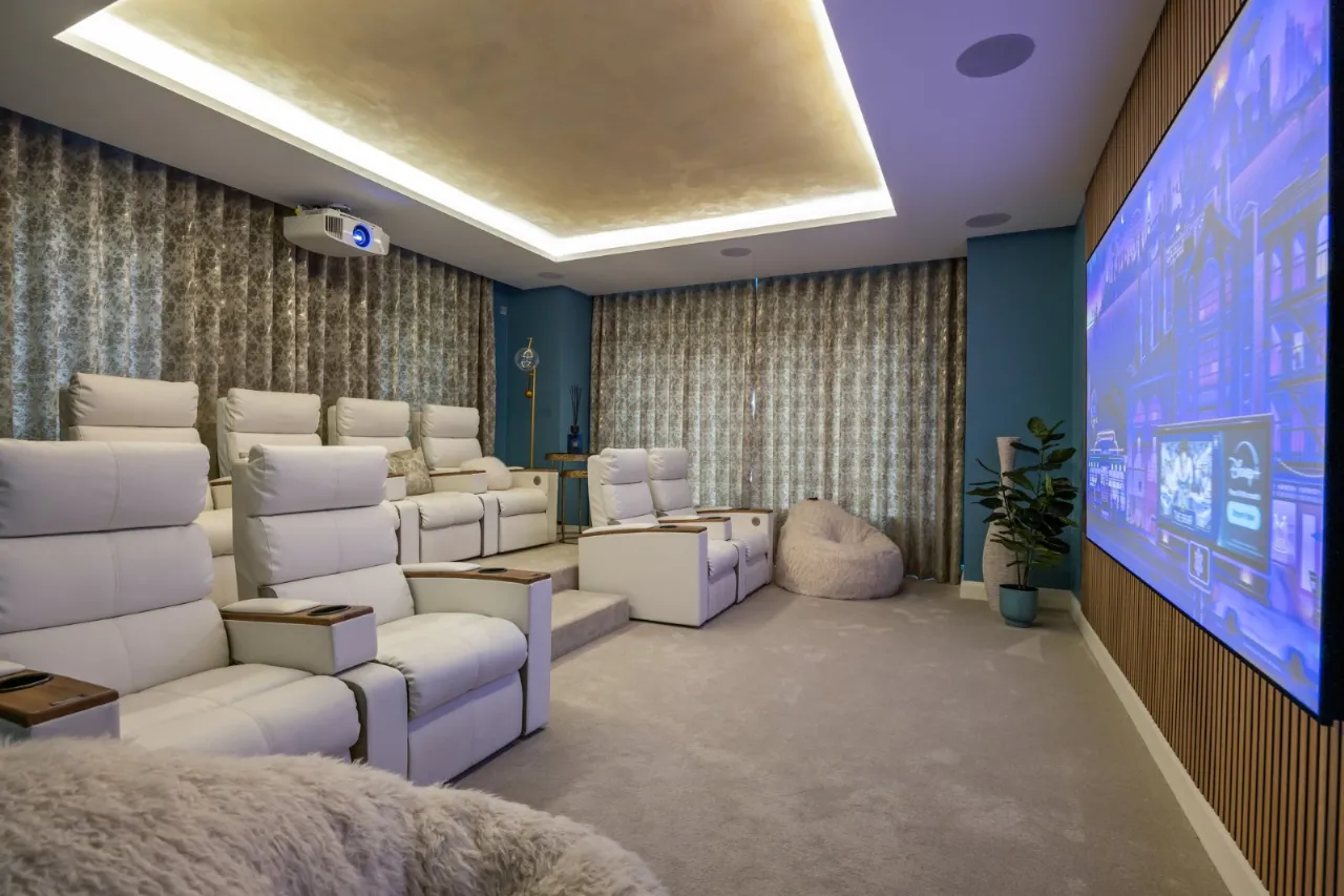 Electrically operated blinds behind concealed pelmet. Lowered roof with venetian plaster detail and strip lighting and surround sound provision. Air circulation system. Option for a full Sony projector for movies, TV, sport and music. Step up to 4 cinema style seats with drink provision and electrically operated La Z Boy function with 4 on ground level, all facing cinema screen in an acoustic wall - a truly fantastic room.