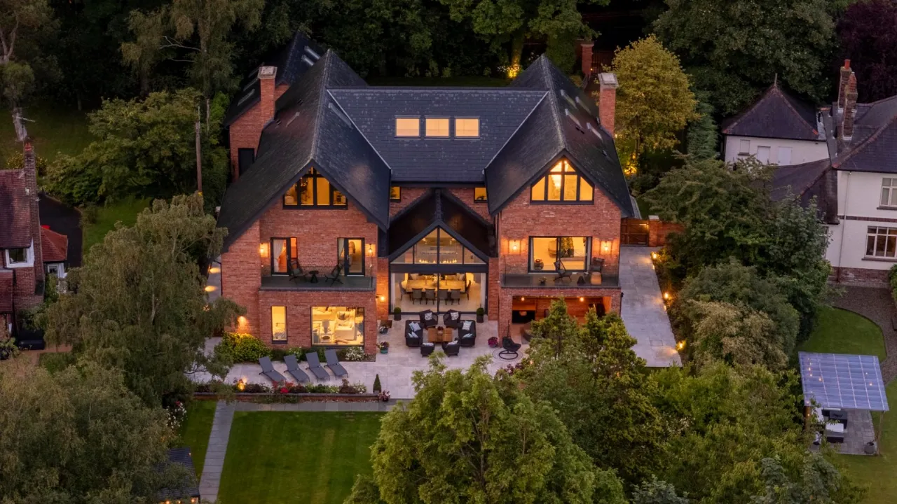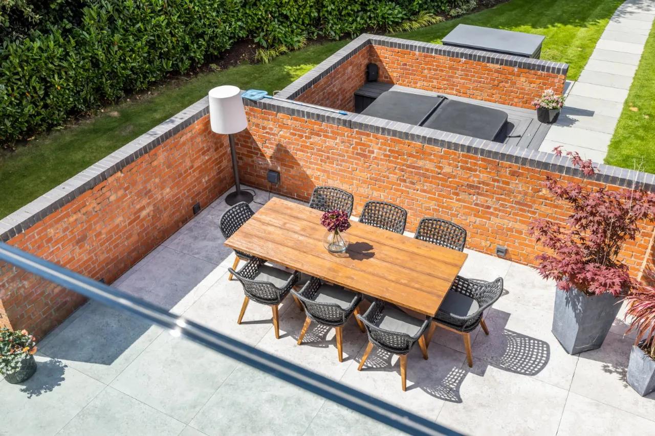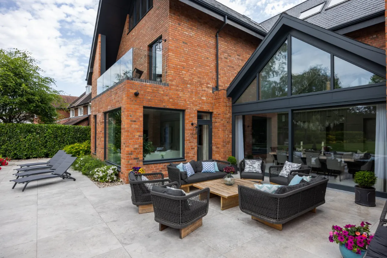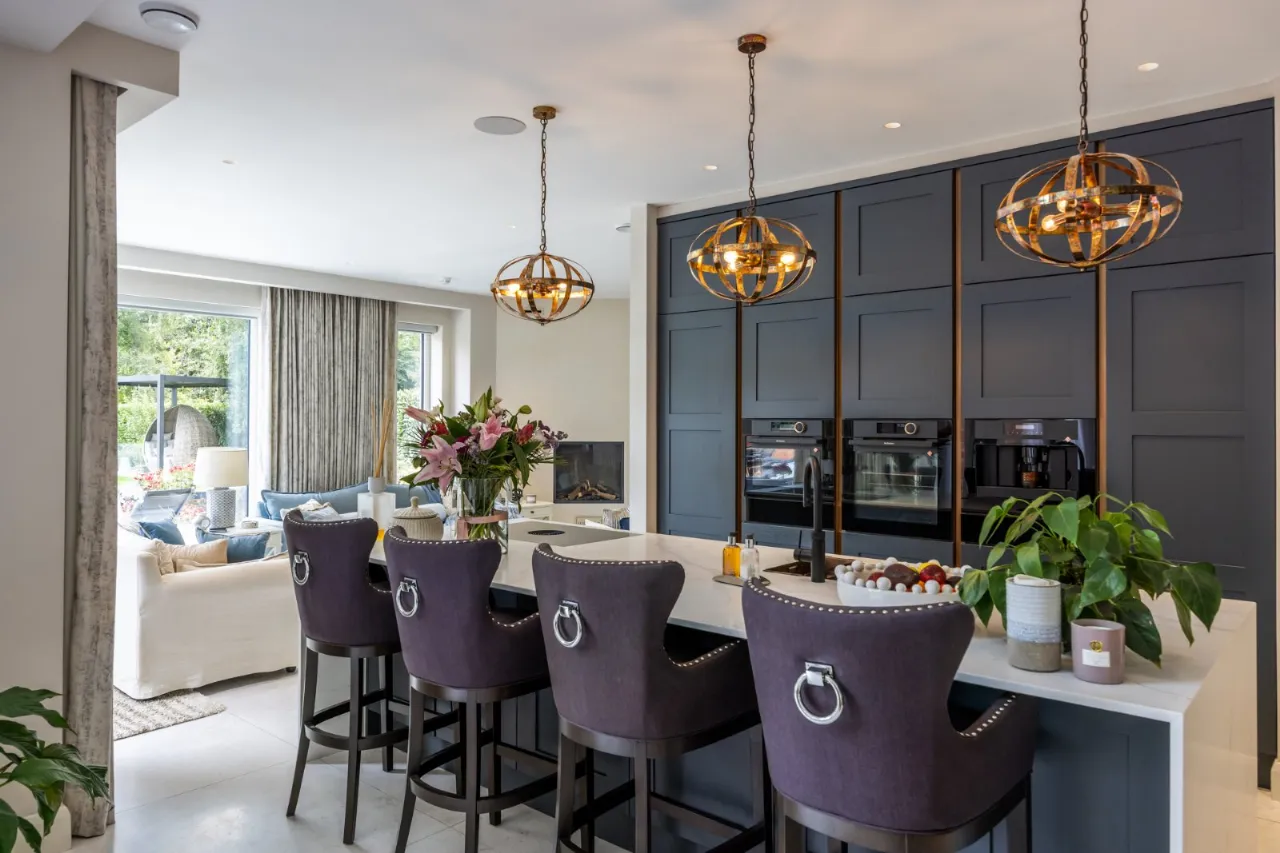 Tiled floor, double height ceiling with feature triangular eaves windows. Wired for Sonos. Automated window blinds. Space for 12-14 seater dining table and chairs, a large glazed sliding door which leads to entertaining patio which overlooks the rear gardens and BBQ area.
