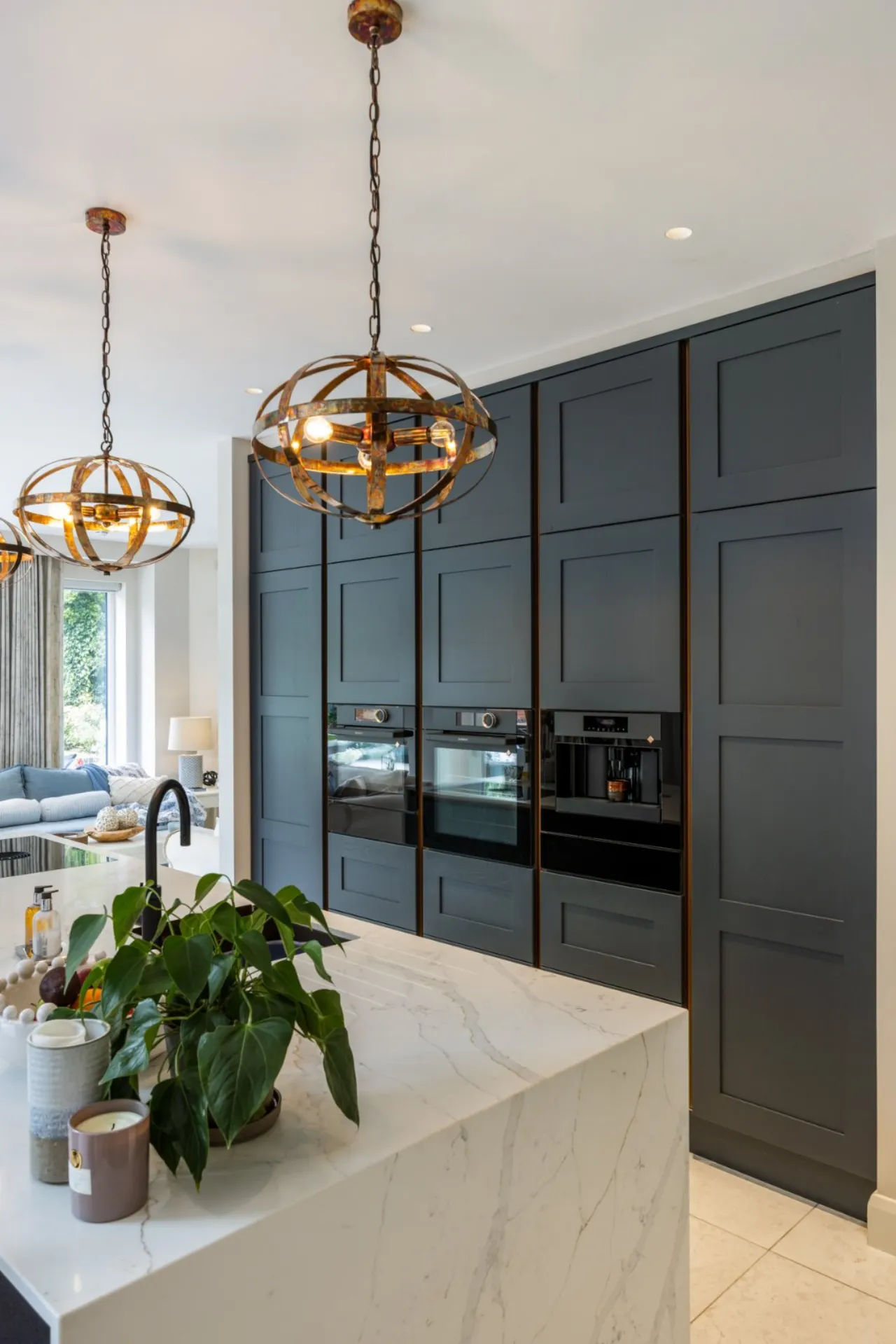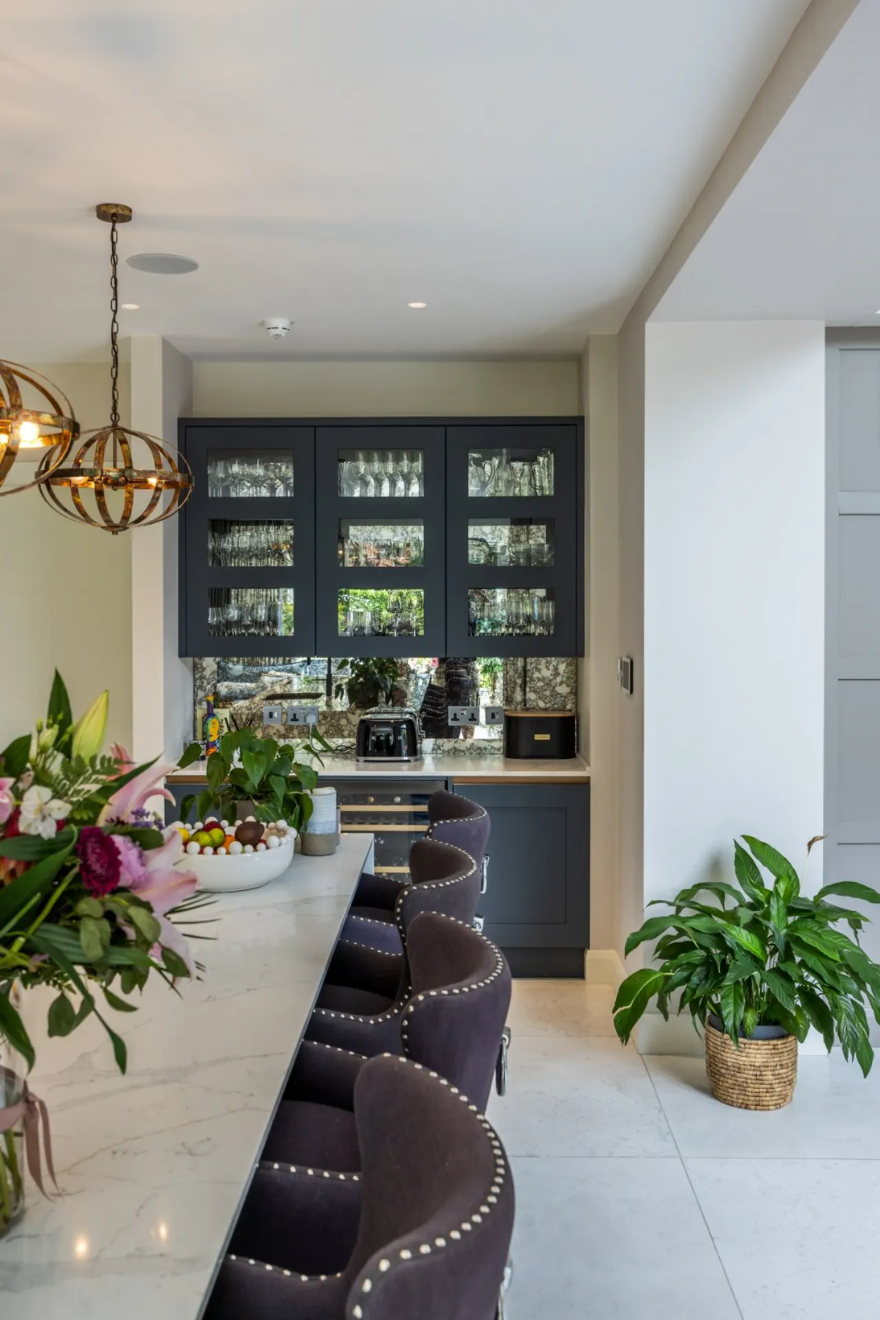 Bespoke kitchen with tiling. Large island unit with marble worktops, Franke style sink and drainer with Quooker tap including Cube , Bora downdraft four ring cyclone cooker, array of cupboards, drawers, shelves and units and four high back chairs at breakfast bar. Side panel with wine fridge, cabinetry, coffee dock area with antique style mirrored background with built in cabinetry above for glassware, full size fitted fridge, De Dietrich oven, combi microwave oven and two warming drawers, full size freezer with built in cabinets. Wired for Sonos. Side pantry with remote lighting, ample built in cupboards, open shelving, integrated fridge and marble worktops.