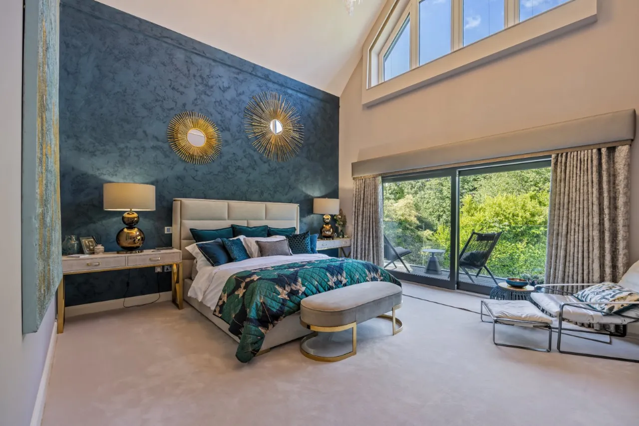 Ceiling height of 6.8 metres. Amazing bedroom with space for wall mounted TV, automated curtains and blind, sliding door to large balcony with glazed balustrades overlooking rear south west facing gardens and entertainment areas. Door to: