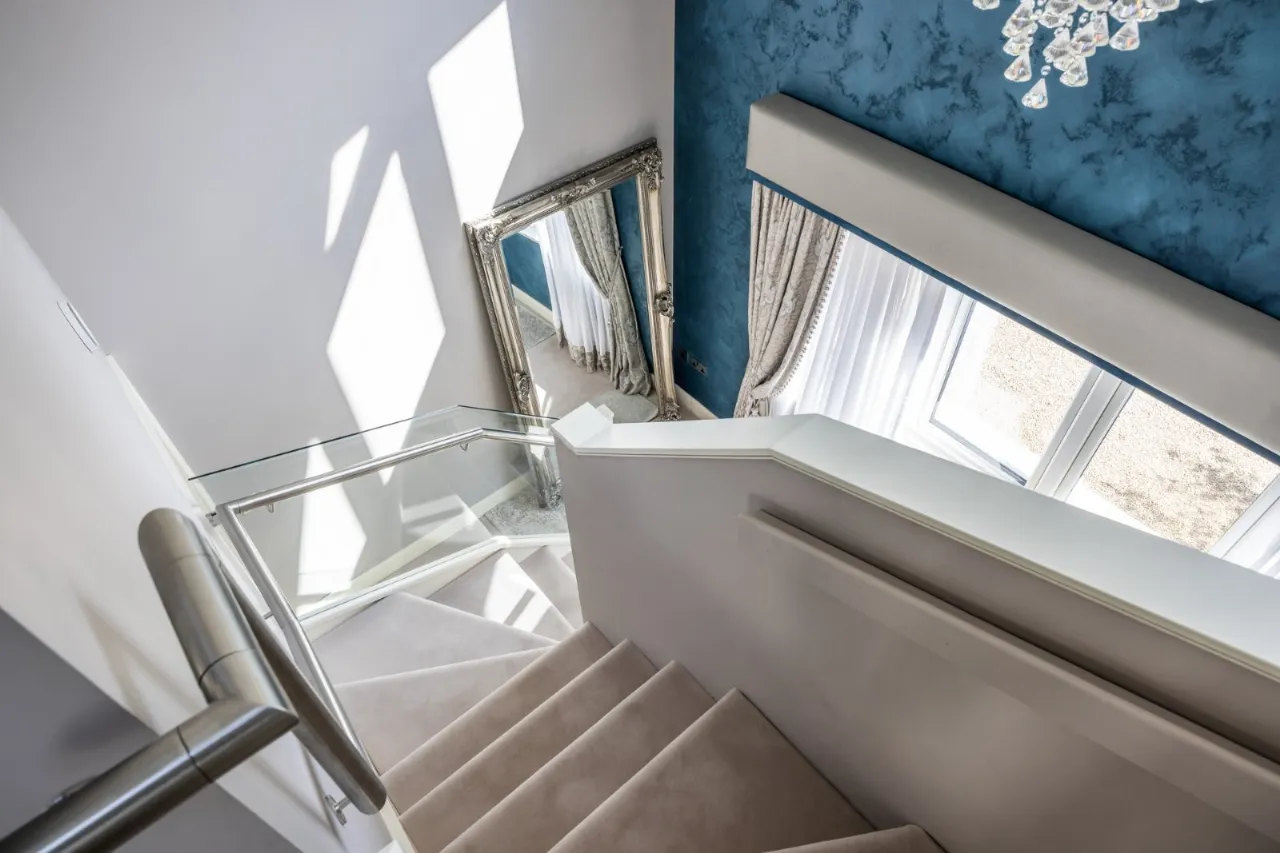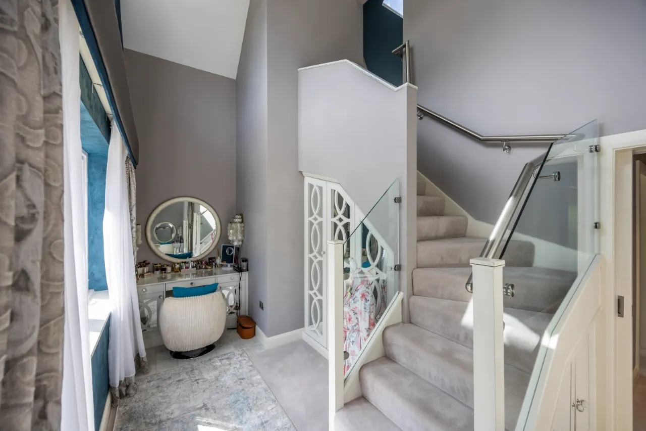 Built in understairs mirror storage, vanity unit with storage on each side, glass balustrade stairwell leading to: