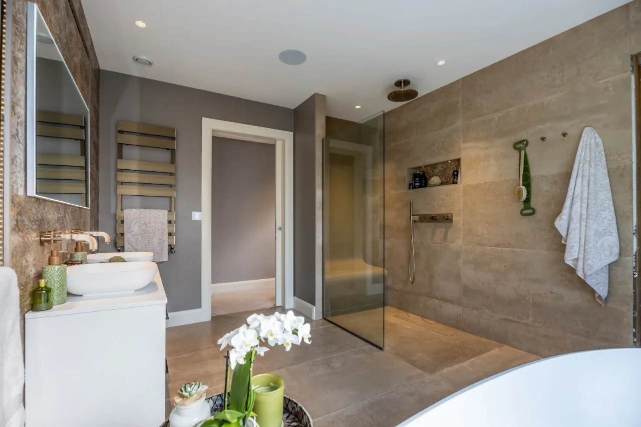 Freestanding oval shaped bath with taps and telephone hand shower, dual sinks in vanity unit with marble bowls and four drawer storage beneath. Heated towel rail, bespoke tiled walls and floor, fitted mirror, large walk in shower with seating area, drench shower and telephone hand shower. Pocket door leading to low flush wc, light well, feature tiled walls and side light. Feature lighting. Automated blind. Wired for Sonos. Door to: