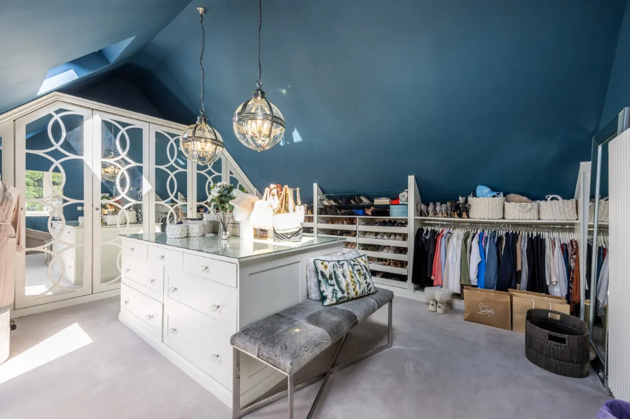 Finished as a full dressing room with central storage unit with built in, cupboards, drawers and shelves, large storage area for shoes, hanging and shelving space, 6 built in wardrobes, Velux windows, automated blinds and feature strip lighting fully carpeted.