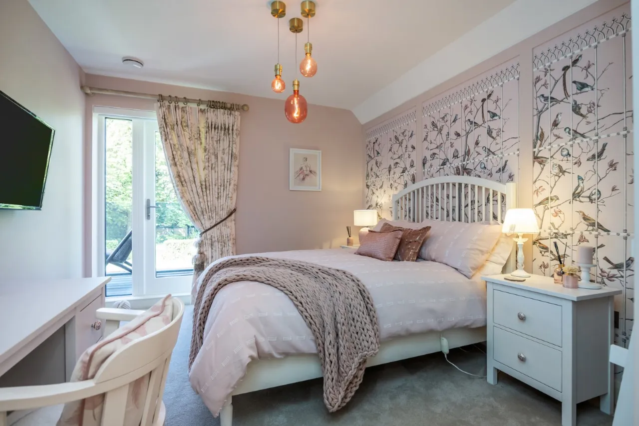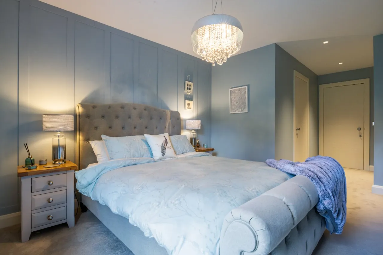 Door to shared first floor balcony overlooking gardens, automated blind, panelled walls, low voltage lighting, two double built in wardrobes, walk in shower room, double shower with drench shower, telephone hand shower, low flush wc with concealed cistern, vanity unit with taps, mirror over, heated towel rail, built in storage, tiled walls, tiled floor.