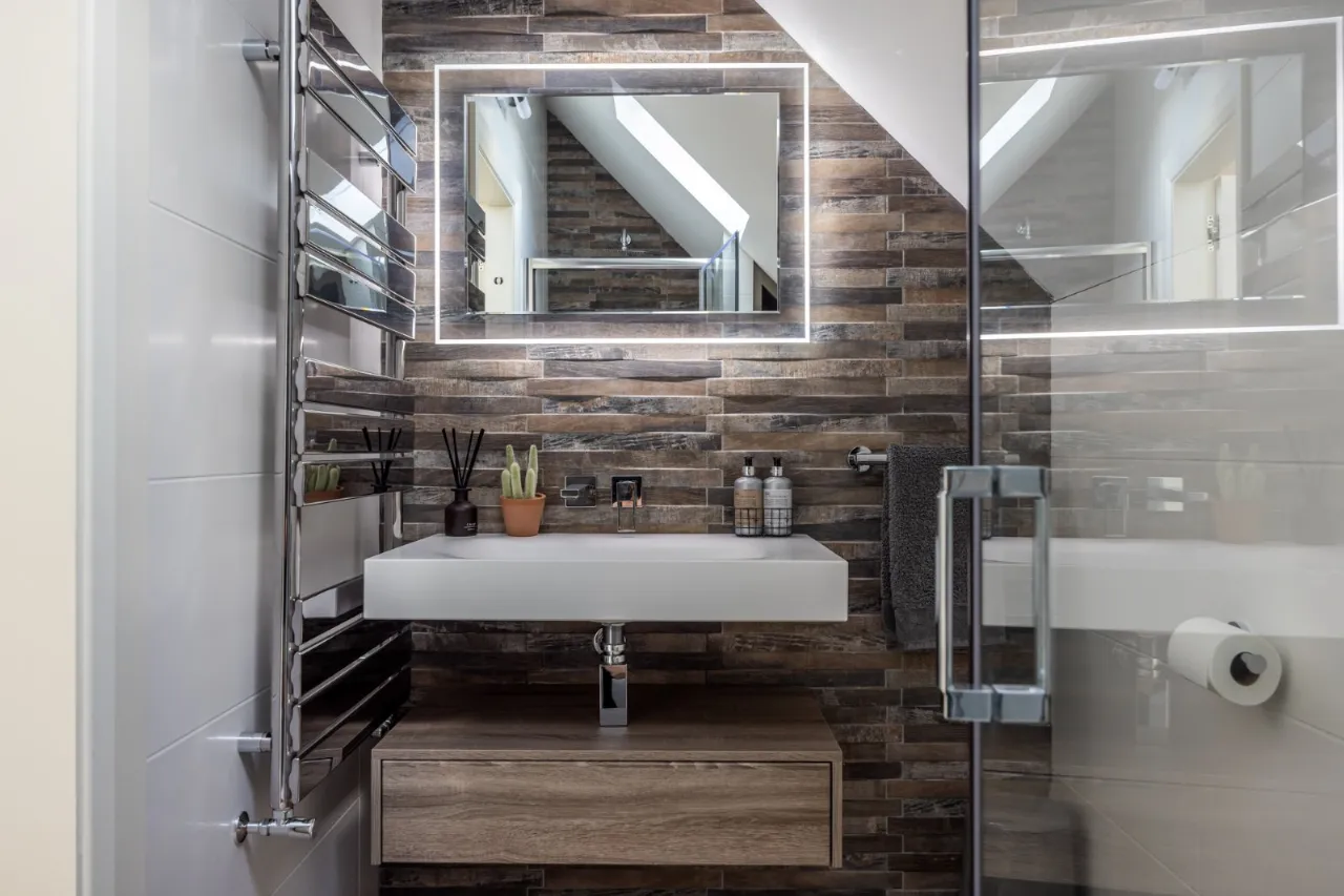 Velux window, door to shower room. Fully tiled shower cubicle with drench shower and telephone hand shower, open storage, wc with concealed cistern, vanity unit with backlit mirror and heated towel rail. Door to: