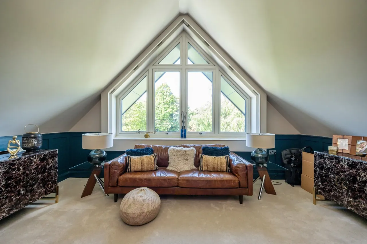 Double height ceiling, large feature window, automated blind overlooking rear gardens, currently set up as home study but has a variety of uses.