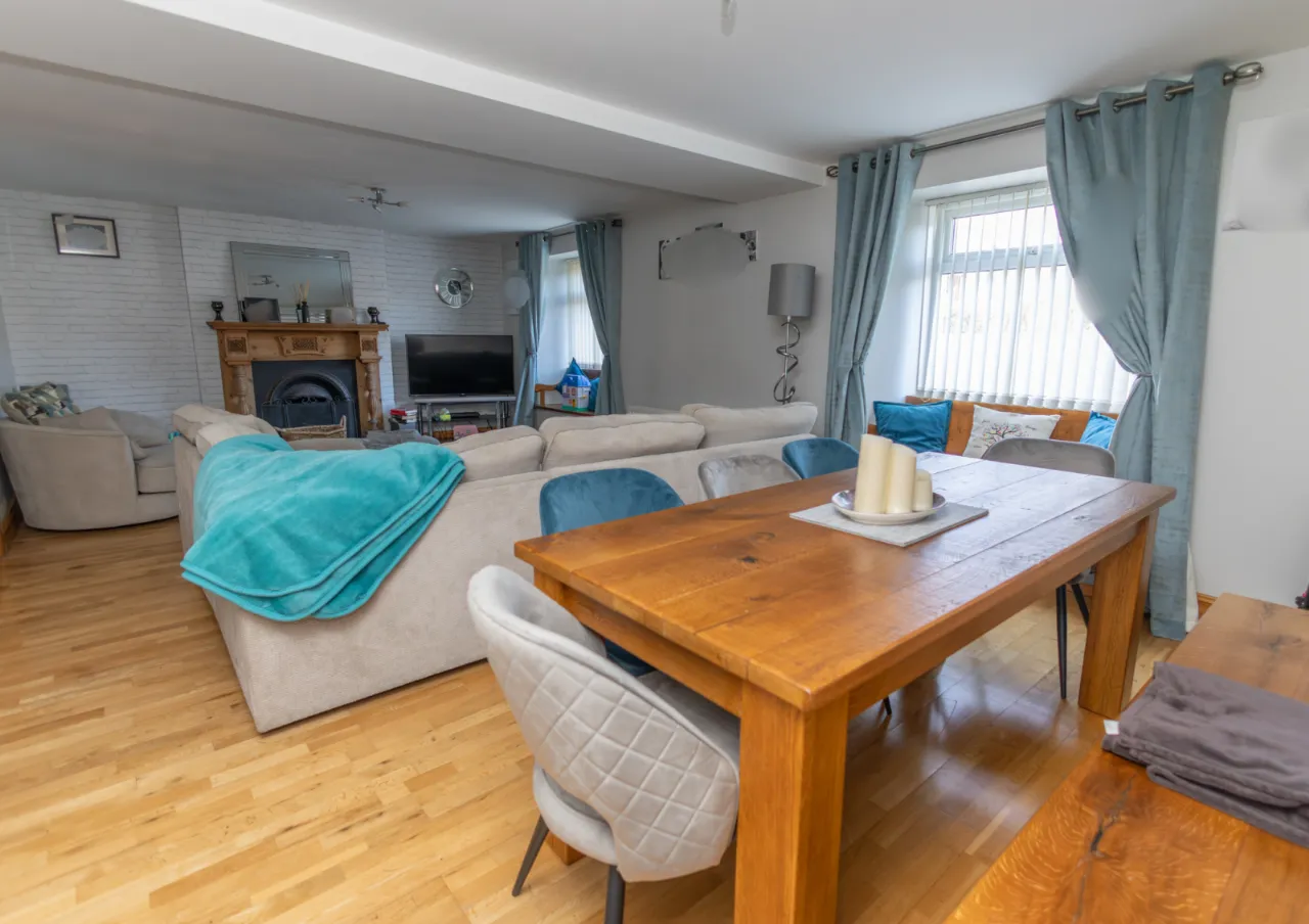 Wooden floor, wooden fireplace with tiled hearth, radiator, 2x bay windows.