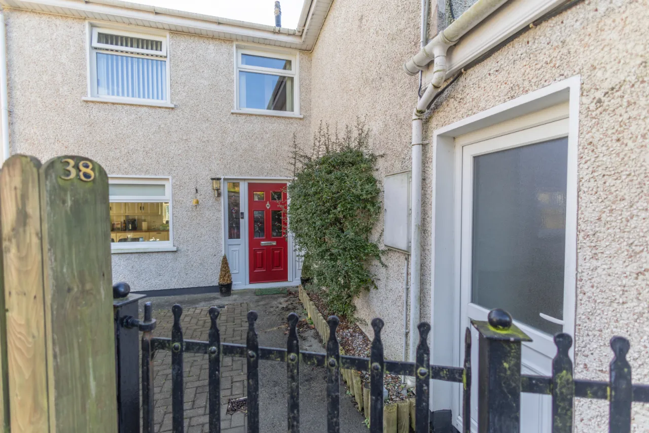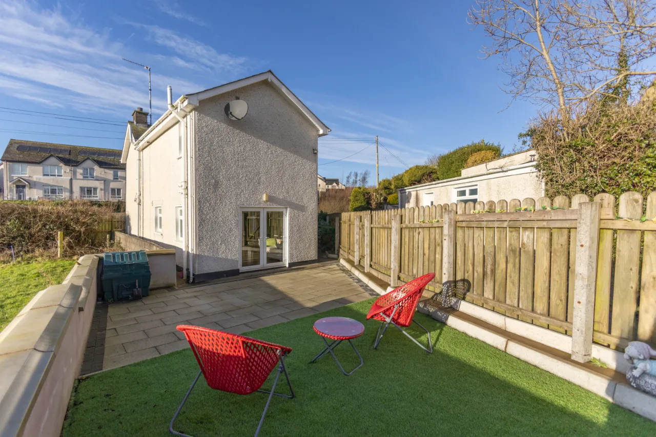 Tiled floor, high and low level storage units, tiled splashback surround, 6th Sense cooker, Beko electric hob, double basin sink, double patio doors leading to rear yard.