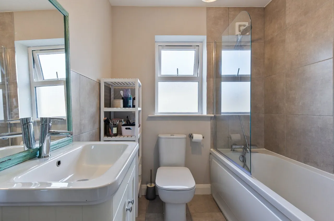 Sink with mixer taps, low flush WC, bath and overhead shower, partially tiled
