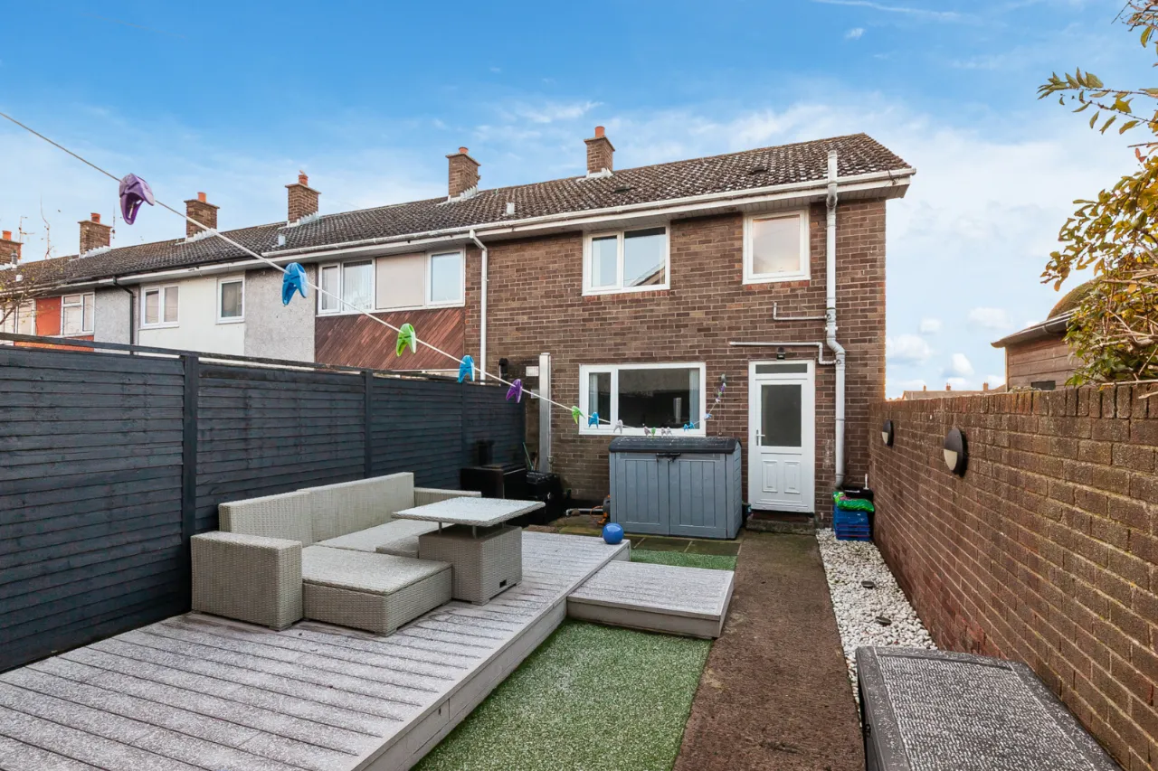 Fully enclosed rear garden with paved patio area, raised composite decking area with bordering fencing and wall. Outside lights and tap.