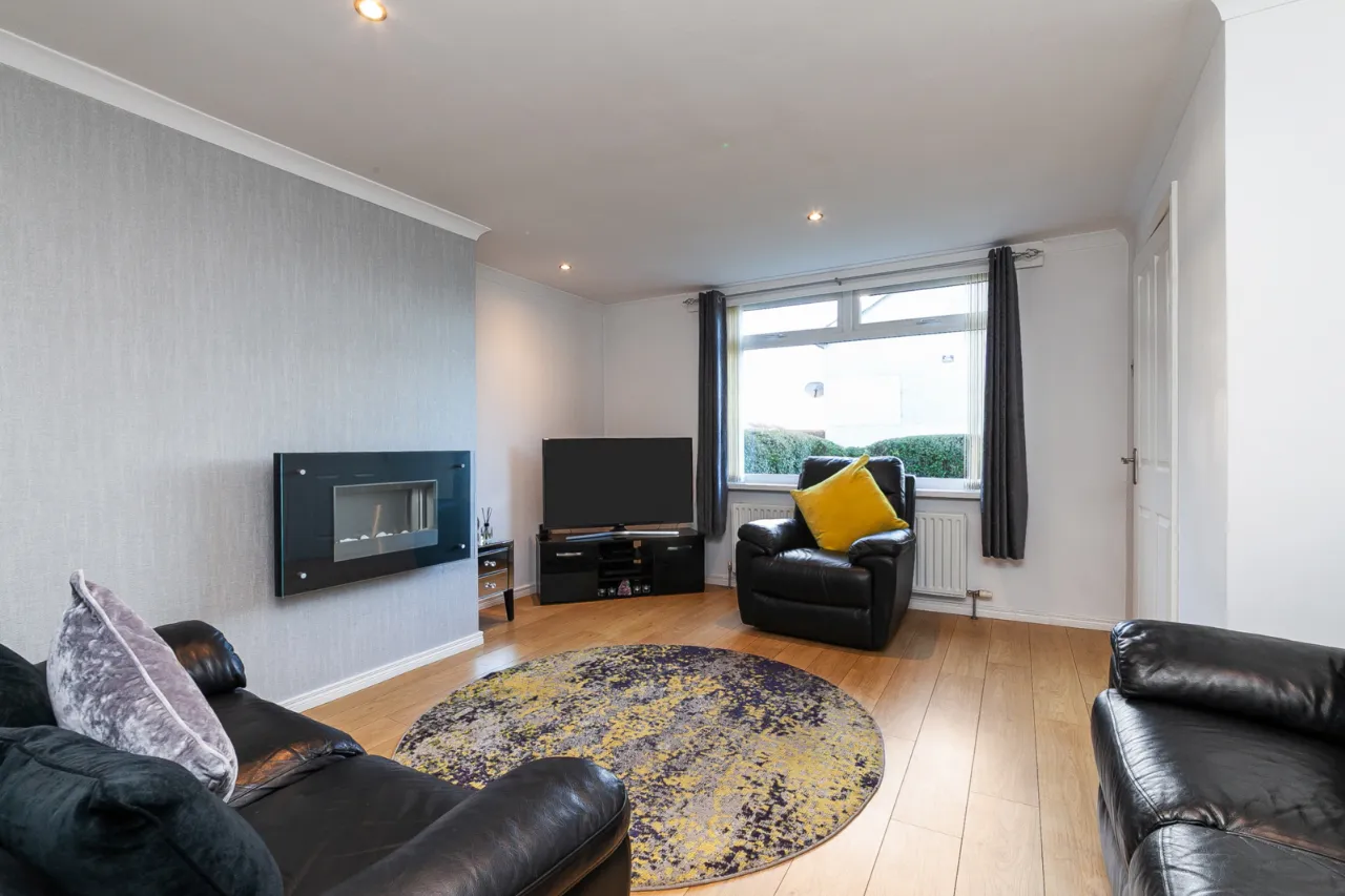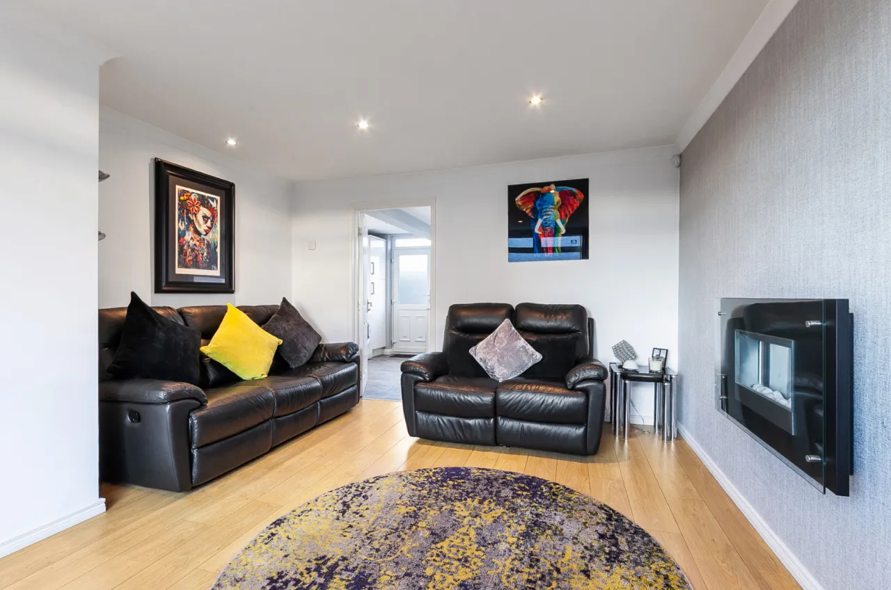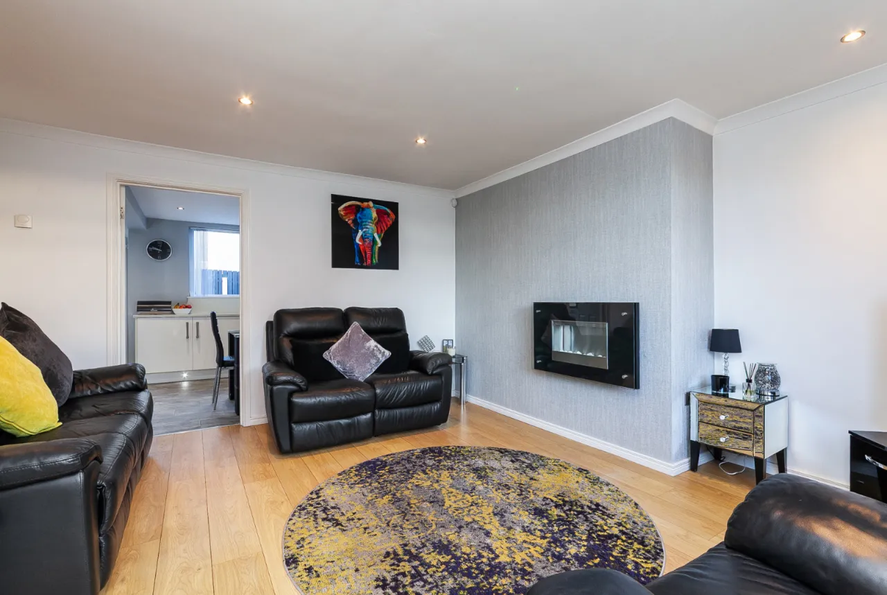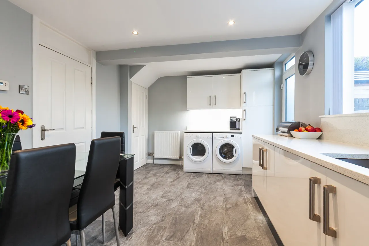 Excellent range of high and low level units, stainless steel FRANKE sink and tap. Quartz worktops, four ring Hotpoint induction hob and under bench oven, overhead extractor hood, space for fridge and freezer. Plumbed for washing machine, space for tumble dryer, larder storage, ample driving space, recessed lights, under stair storage and access to rear garden.