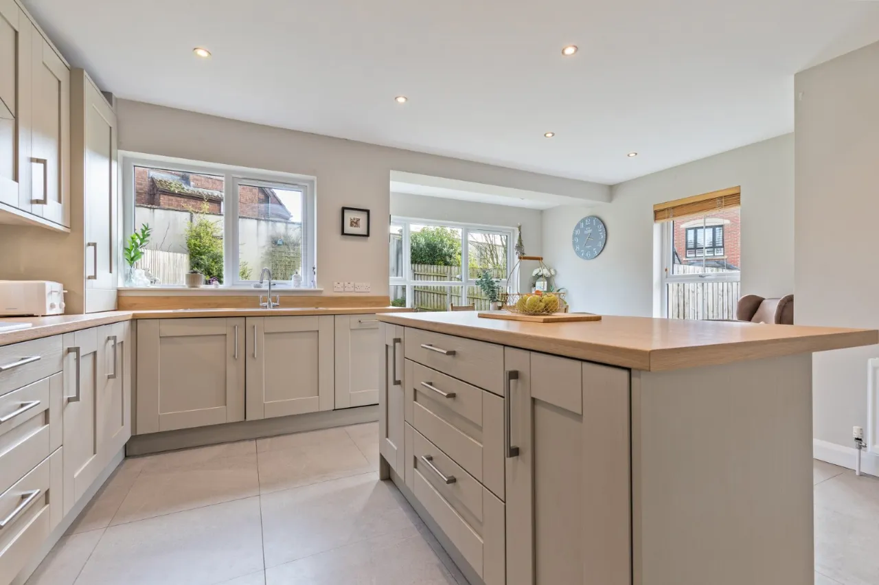 Ceramic tiled floor, spotlighting, range of high and low level units, integrated fridge freezer, electric oven, microwave, 4 ring gas hob, glass and stainless steel extractor fan, 1.5 bowl stainless steel sink unit, integrated dishwasher, Ideal gas boiler, centre island, integrated washing machine, uPVC double glazed door leading outside
