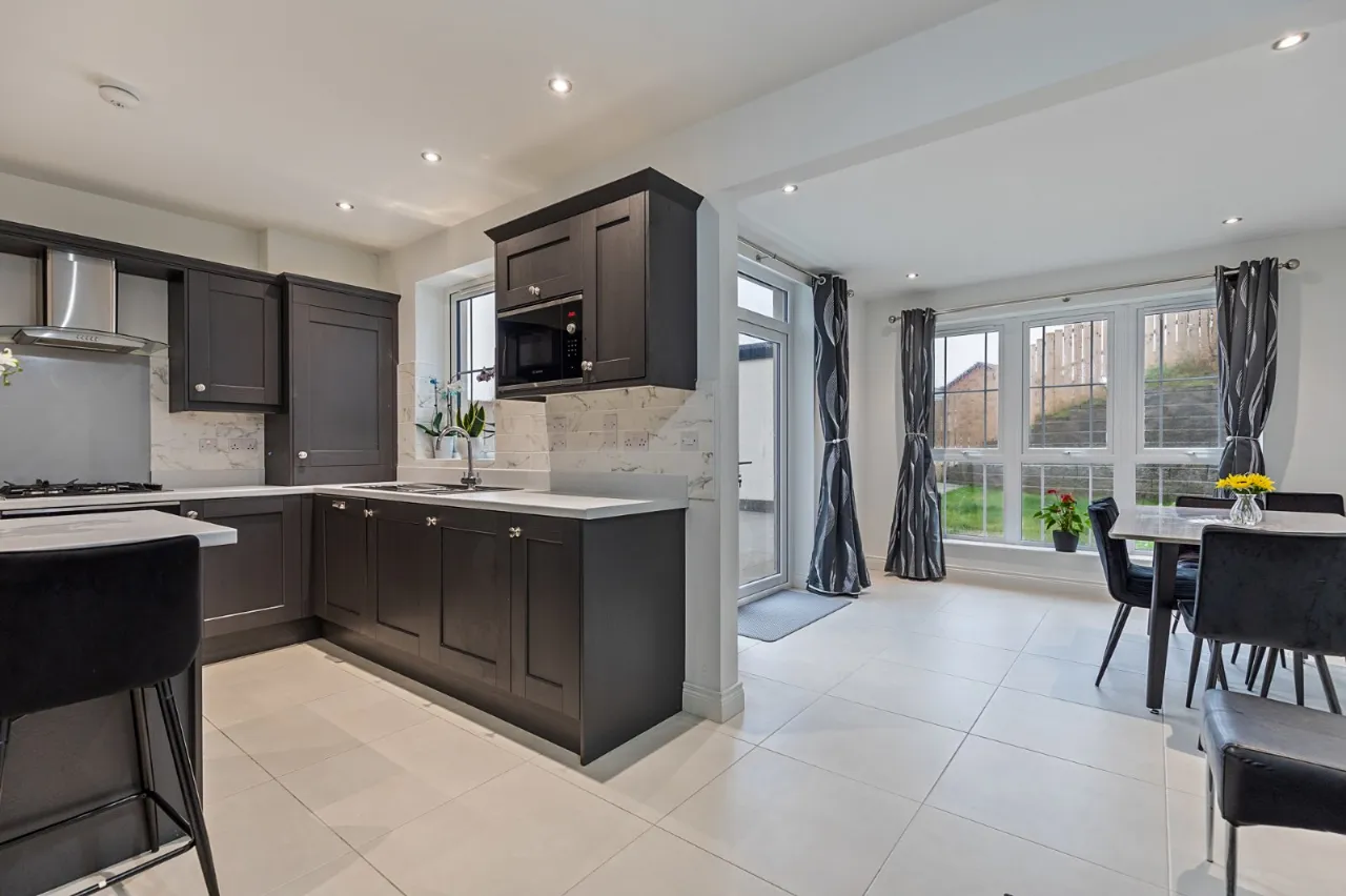 Spotlighting, range of high and low level units, integrated fridge freezer, 1.5 bowl stainless steel sink unit, integrated washing machine, integrated dishwasher, 4 ring gas hob, stainless steel extractor fan, Worchester gas boiler