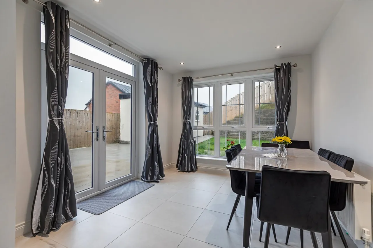 Tiled floor, spotlighting, double uPVC doors to paved patio