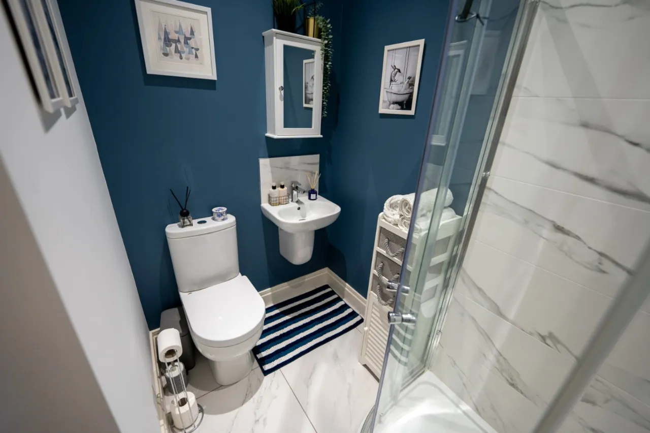 Low flush WC. Pedestal wash hand basin. Fully tiled shower cubicle with shower above. Low voltage lighting. Extractor fan.