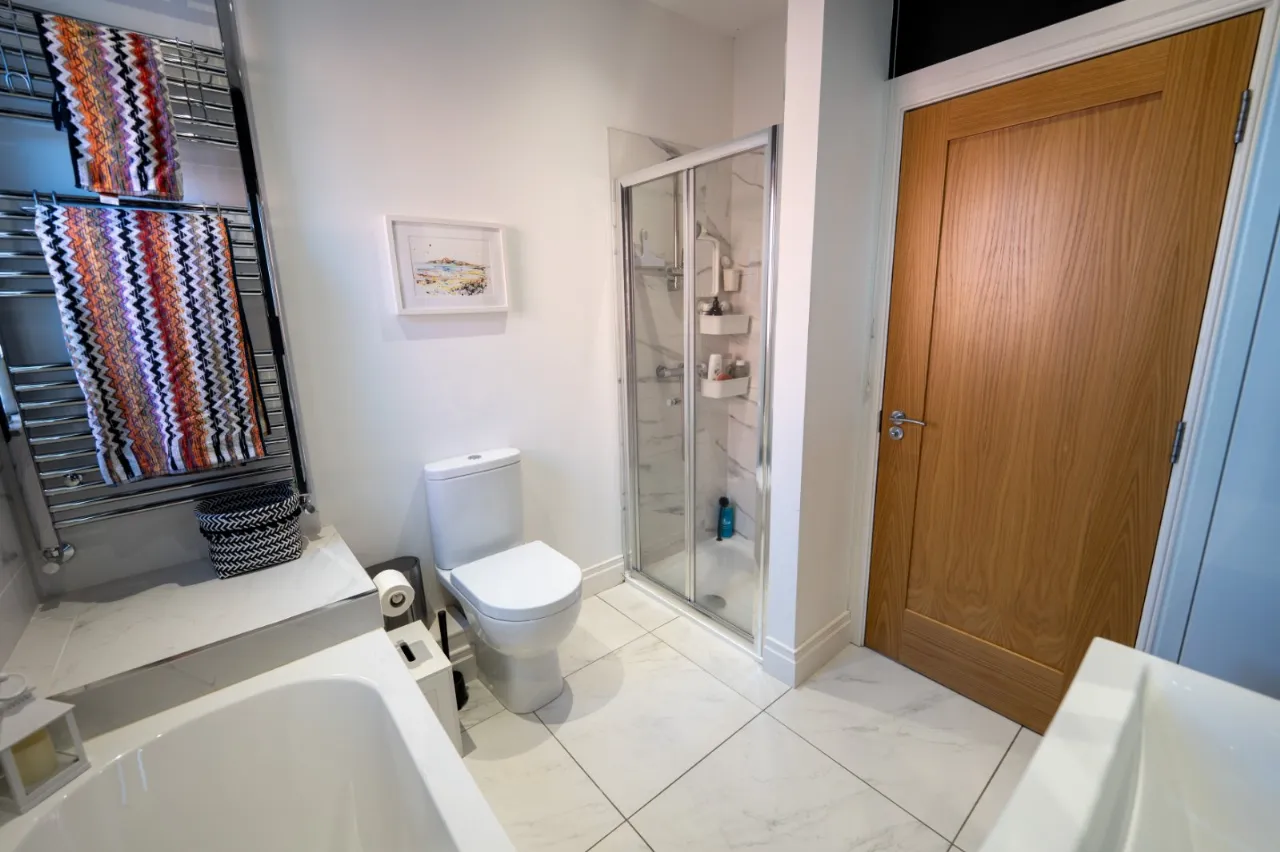 Low flush WC. Pedestal wash hand basin in vanity unit. Bath with tiled surround. Fully tiled shower cubicle. Low voltage lighting. Extractor fan. Ceramic tiled floor.