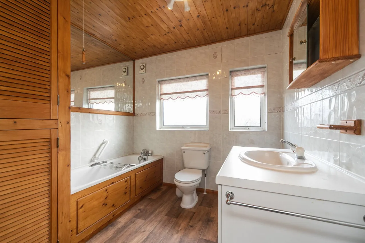 White suite comprising: Panelled bath with mixer taps and thermostatic shower fitting, low flush WC, vanity sink unit with mixer taps, fully tiled walls, chrome towel radiator.