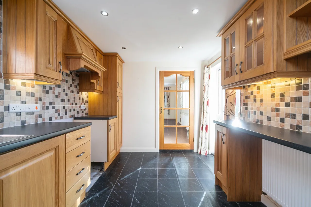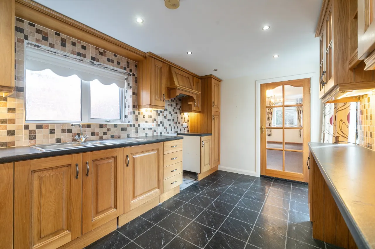 Full range of high and low level units, stainless steel single drainer sink unit, ceramic tiled floor, partly tiled walls.