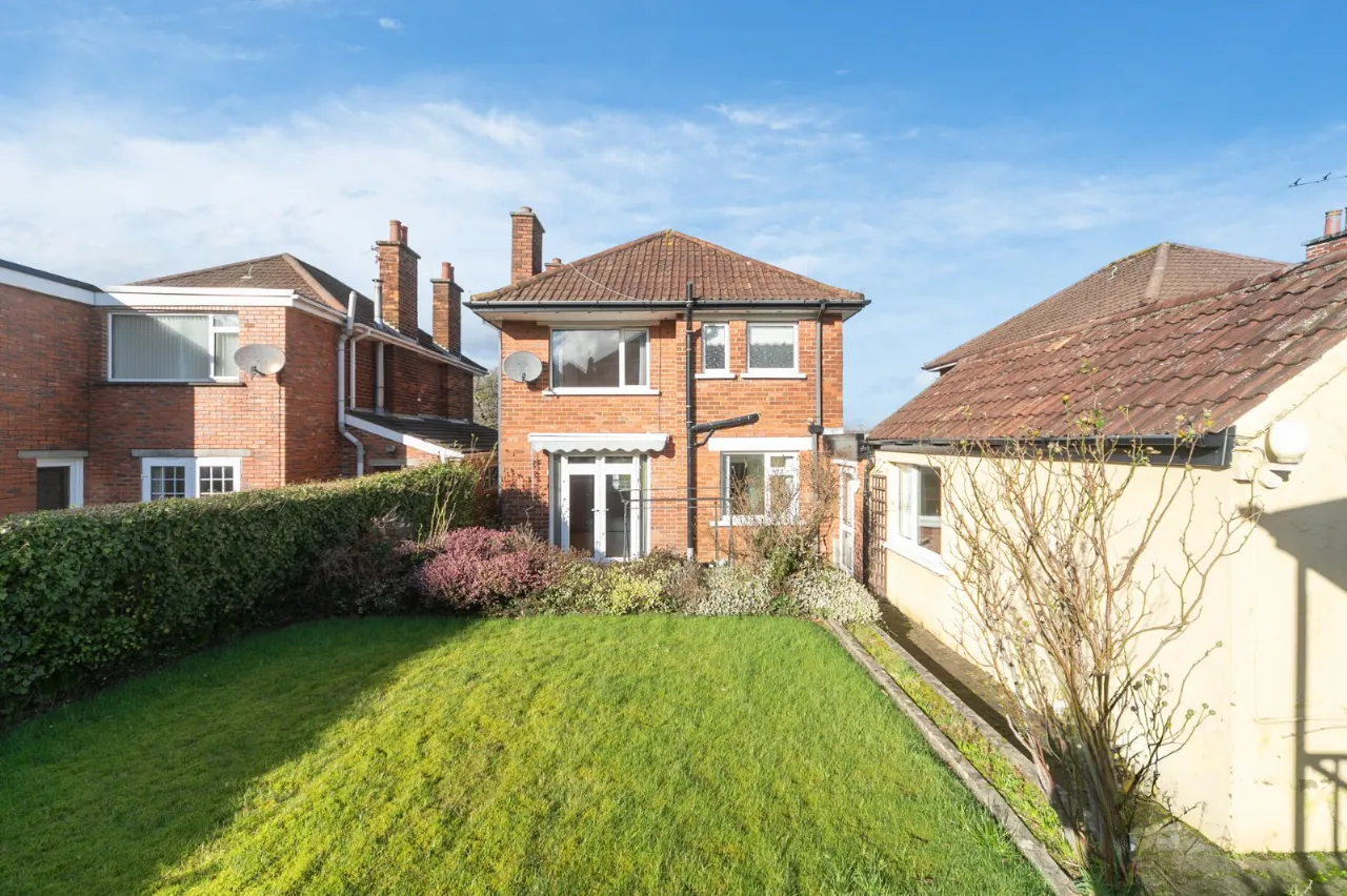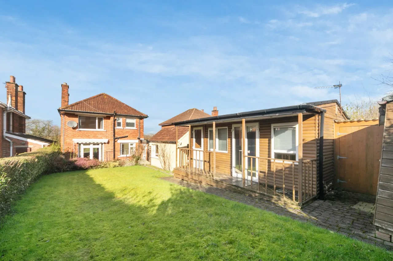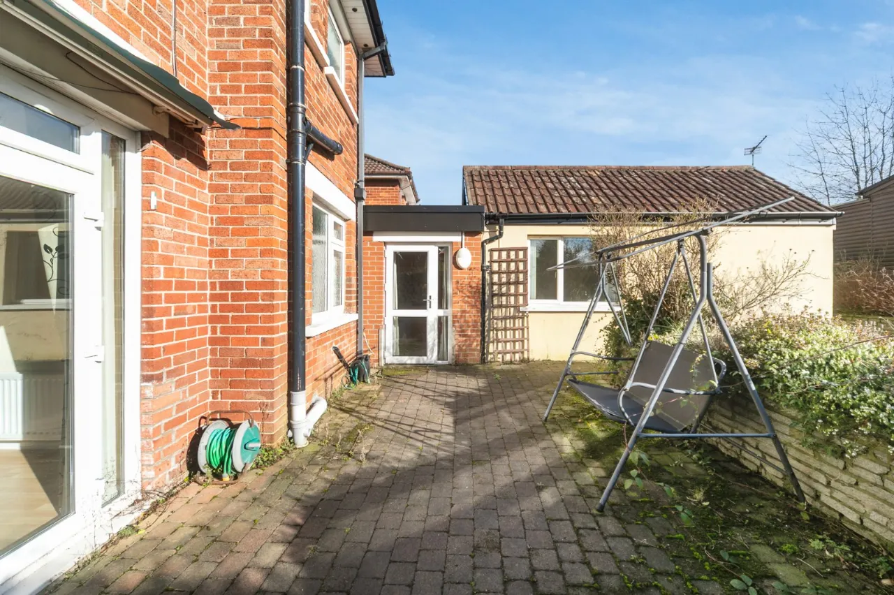 To the rear is a paved patio leading to a garden.