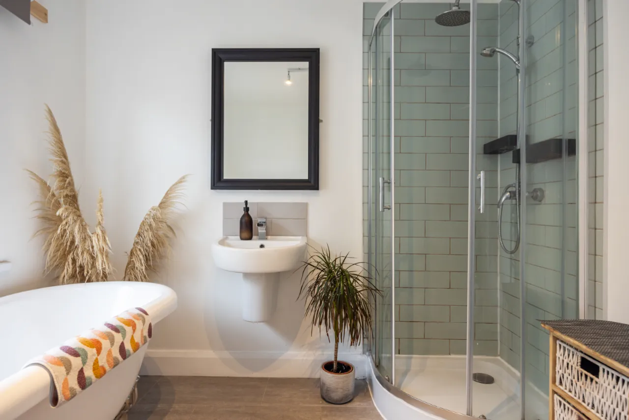 White suite comprising: Oval bath with mixer taps and shower fitting, semi pedestal wash hand basin with mixer taps, low flush WC, fully tiled shower cubicle, overhead rain shower, towel radiator.
