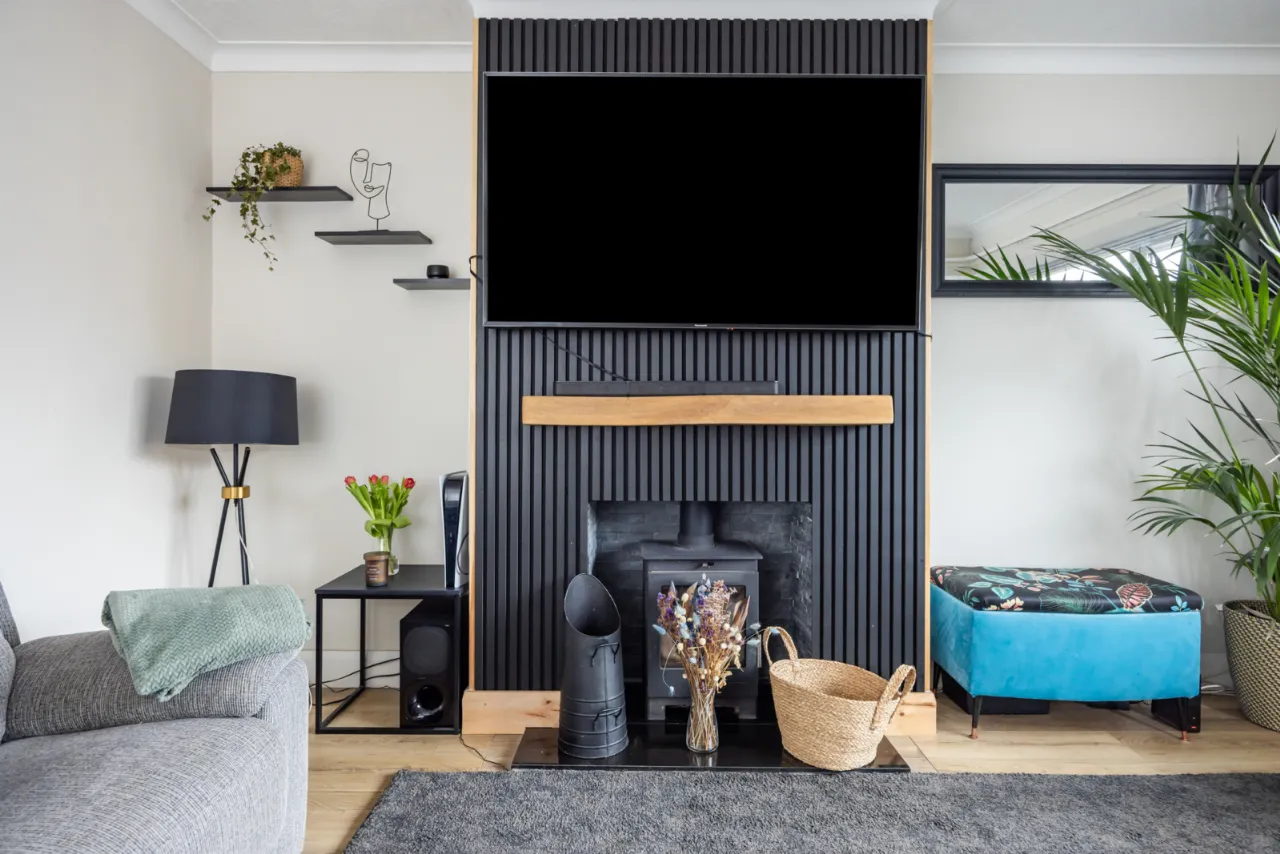 Cast iron stove, wood laminate floor.