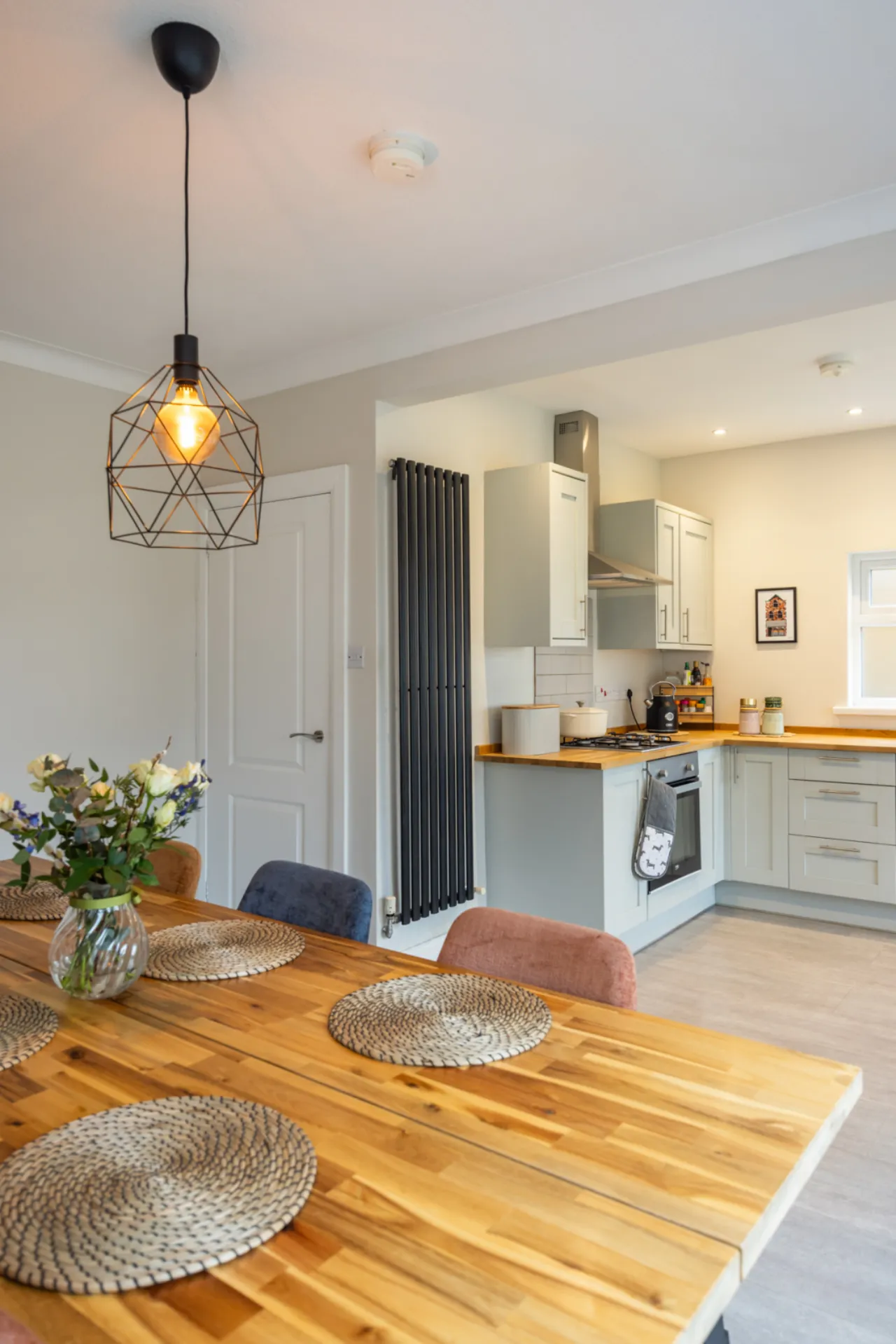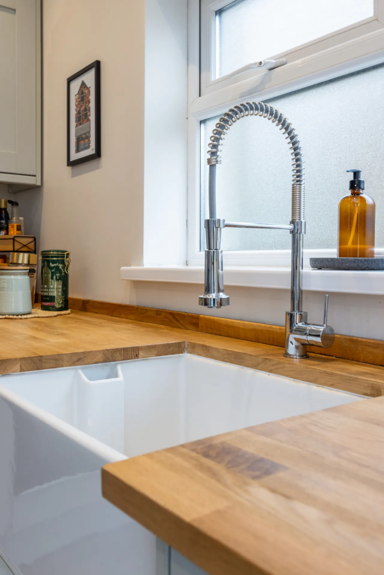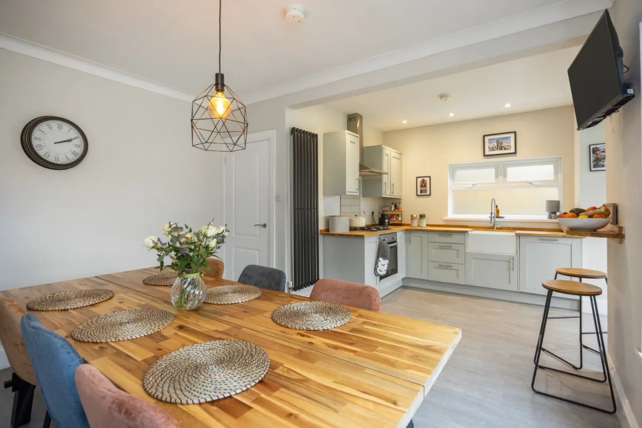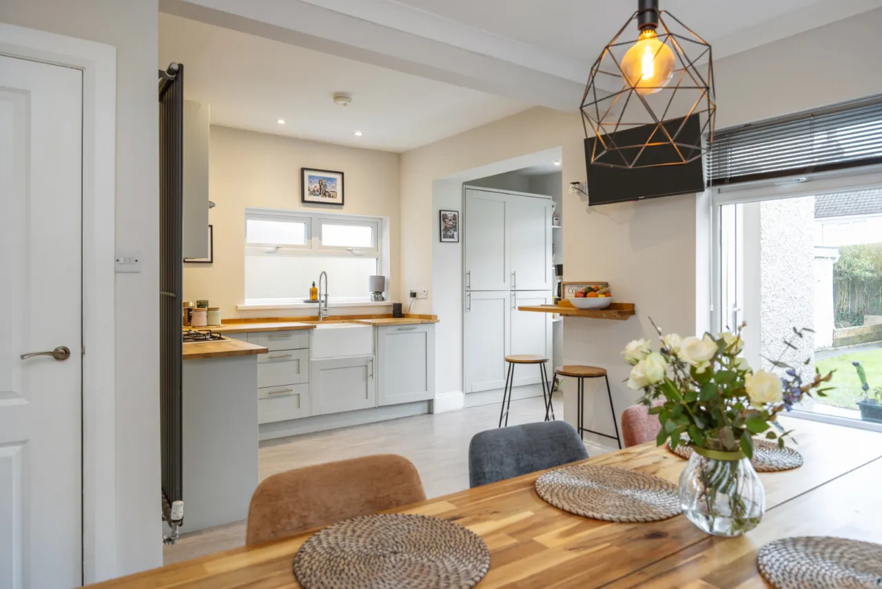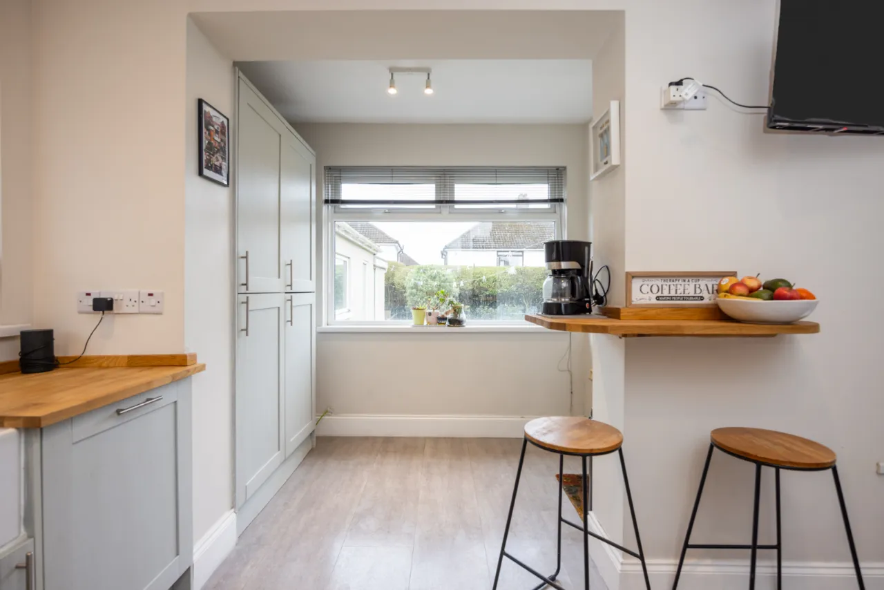 Full range of high and low level units, Belfast sink with mixer taps, built in dishwasher, fridge freezer, plumbed for washing machine, wood laminate floor.