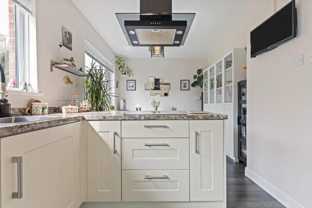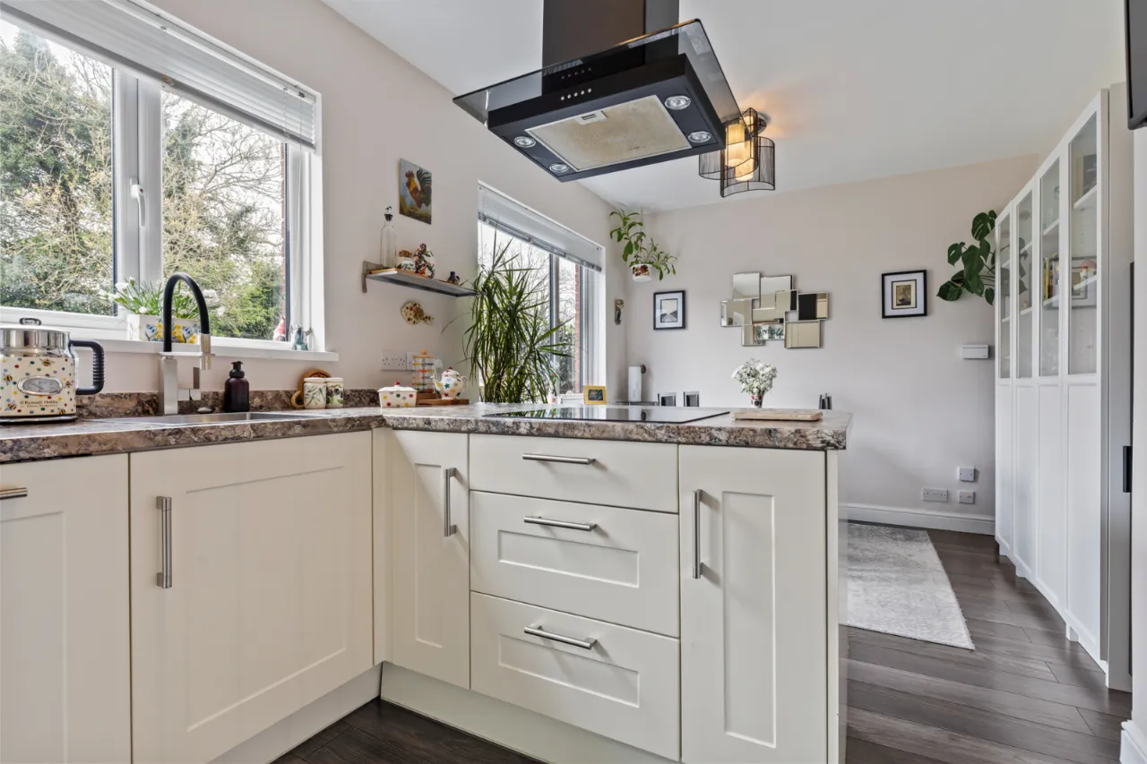 Range of high and low level units, Formica work surfaces with inset stainless steel sink unit and drainer with mixer tap, 1 tub, integrated fridge freezer, integrated oven with integrated microwave above, four ring induction hob with extractor fan above, laminate wood effect flooring, open to dining area, access doors through to rear gardens.