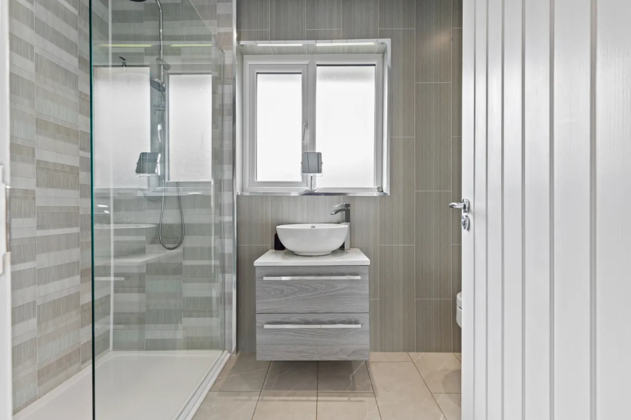 White suite comprising of low flush WC, vanity unit with circular wash hand basin and mixer tap, walk-in thermostatically controlled shower, panelled walls, tiled flooring, recessed spotlighting, extractor fan, vertical chrome heated towel rail.