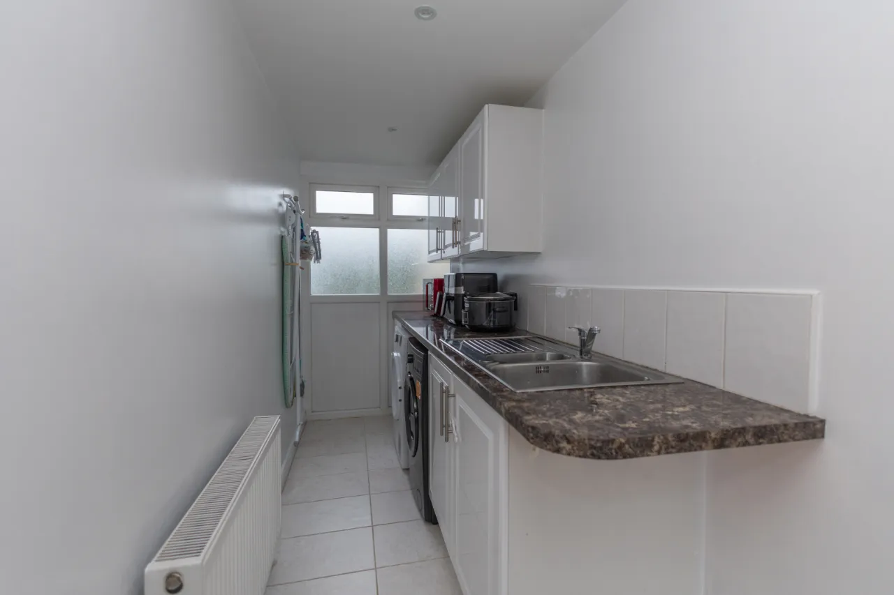 Tiled flooring with upper and lower units, tiled splashback and laminate work surfaces. One-and-a-half bowl stainless steel sink with drainer. Plumbed for washing machine and tumble dryer. Back door leading to the rear garden, with internal access through to the garage.