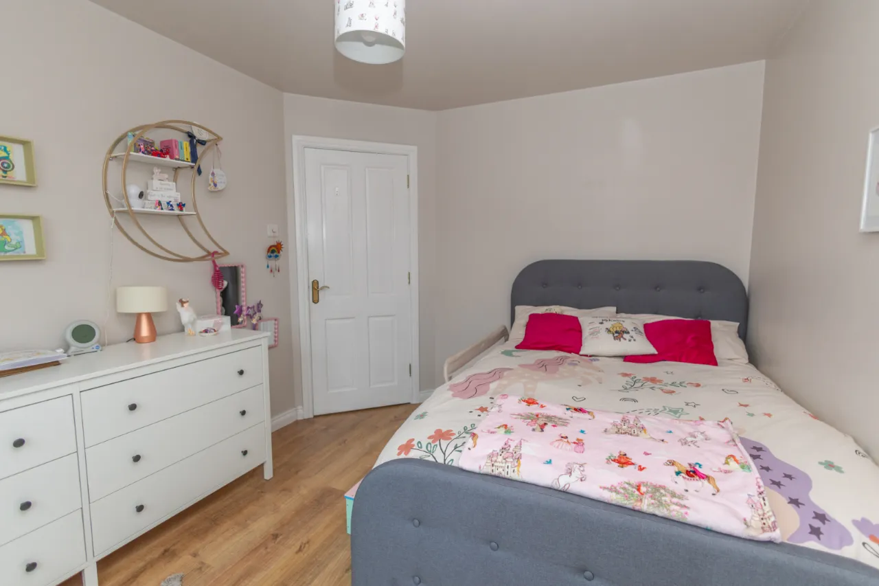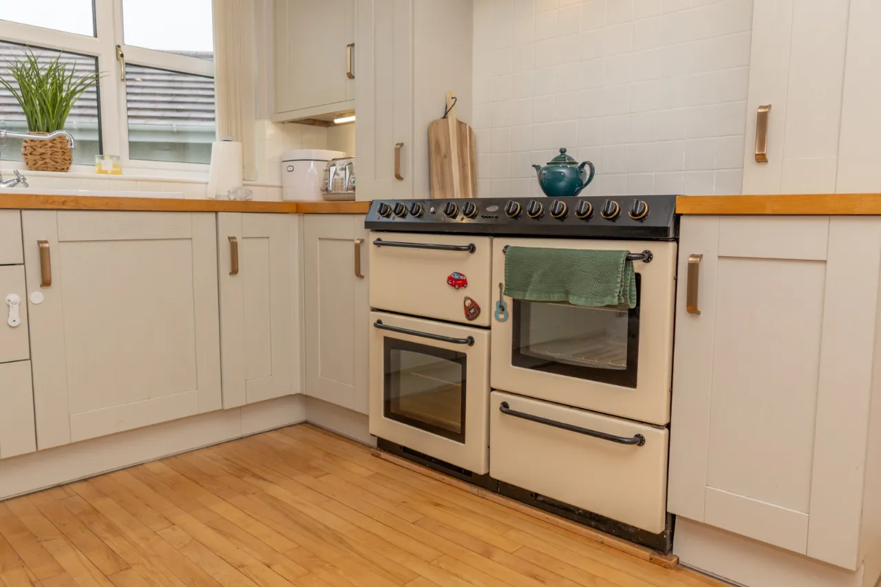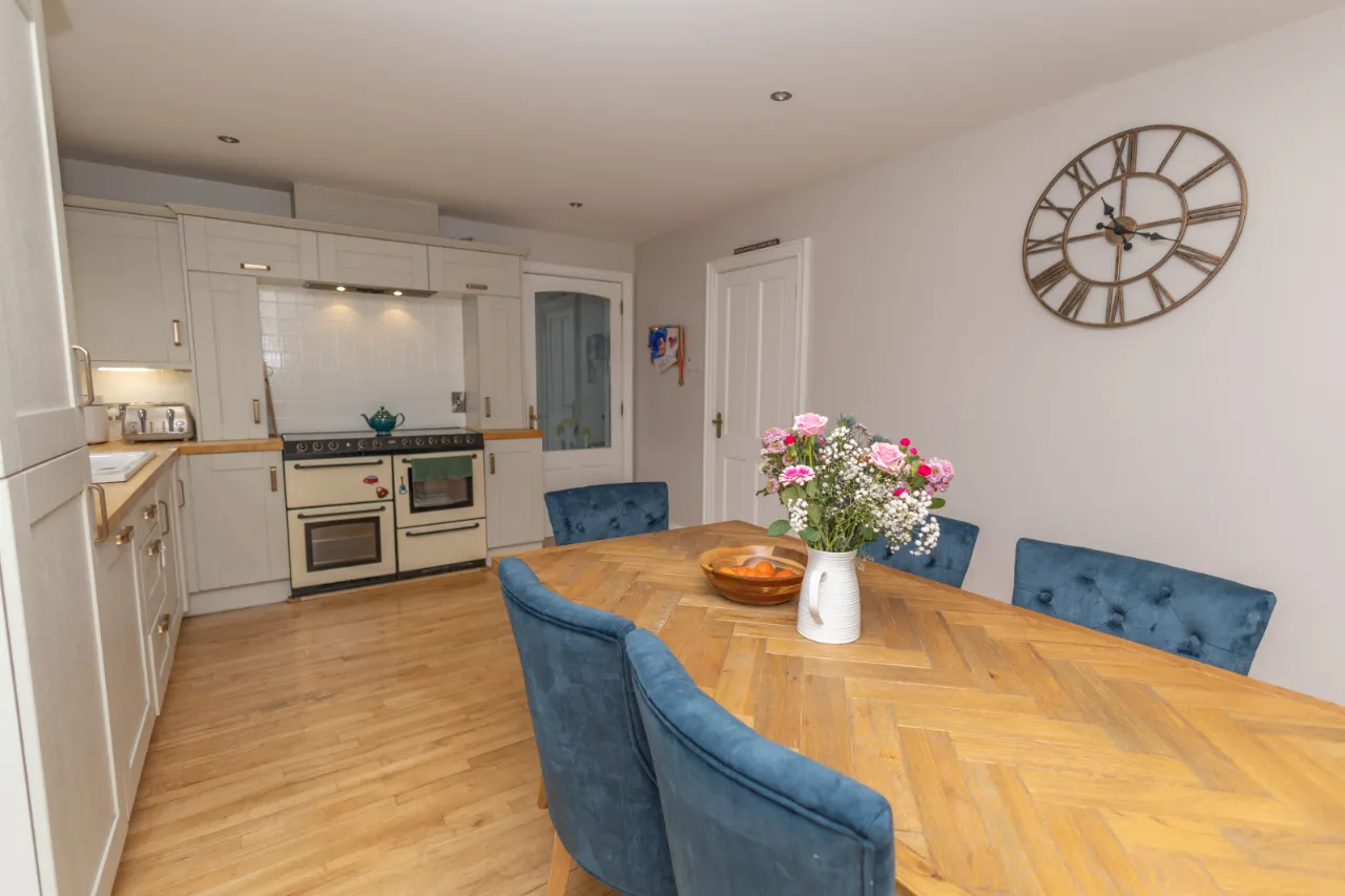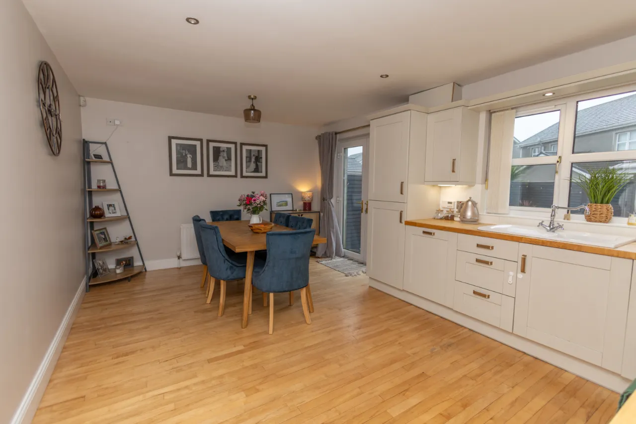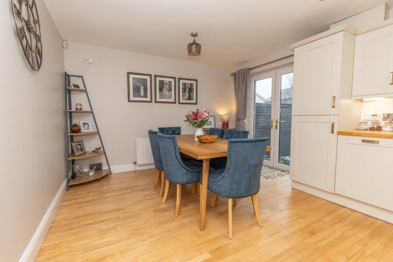 Fitted with a range of upper and lower units, tiled splashback and wooden work surfaces, complemented by solid wood flooring. One-bowl Blanco sink with drainer. Integrated appliances include dishwasher and fridge freezer, with a range-style cooker to remain. Double radiator. Patio doors from the dining area open directly onto the enclosed rear garden, ideal for indoor–outdoor living.