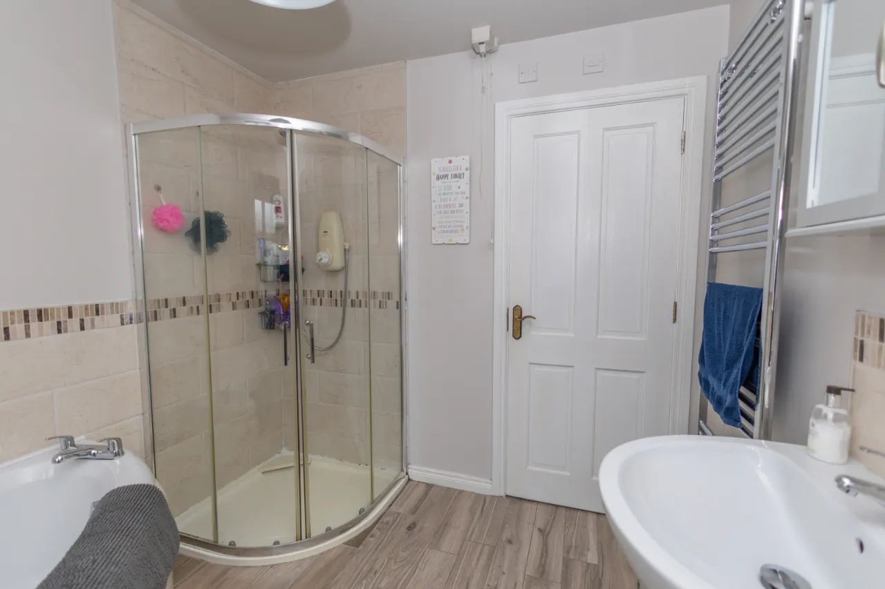 Wood-effect tiled flooring with white suite comprising WC and wash hand basin with vanity unit beneath and mirrored vanity above. Heated towel rail. Corner Aqualisa mains shower and corner jacuzzi bath with tiled surround.