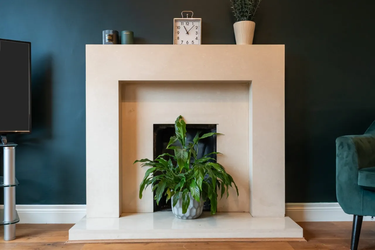 Wooden floor, corniced ceiling, feature fireplace (open).