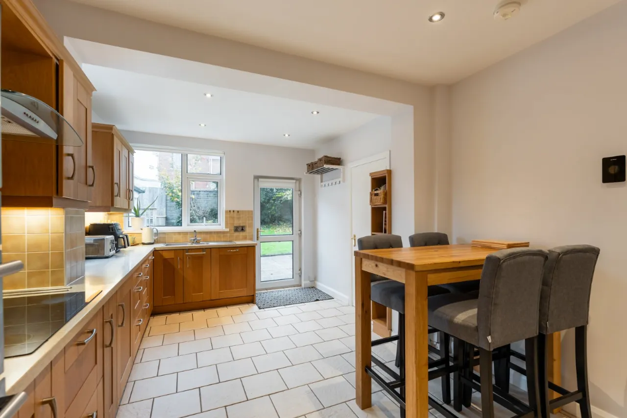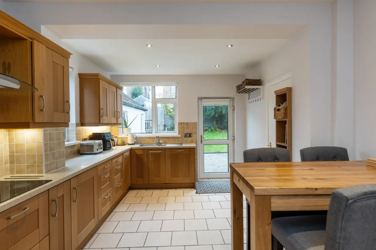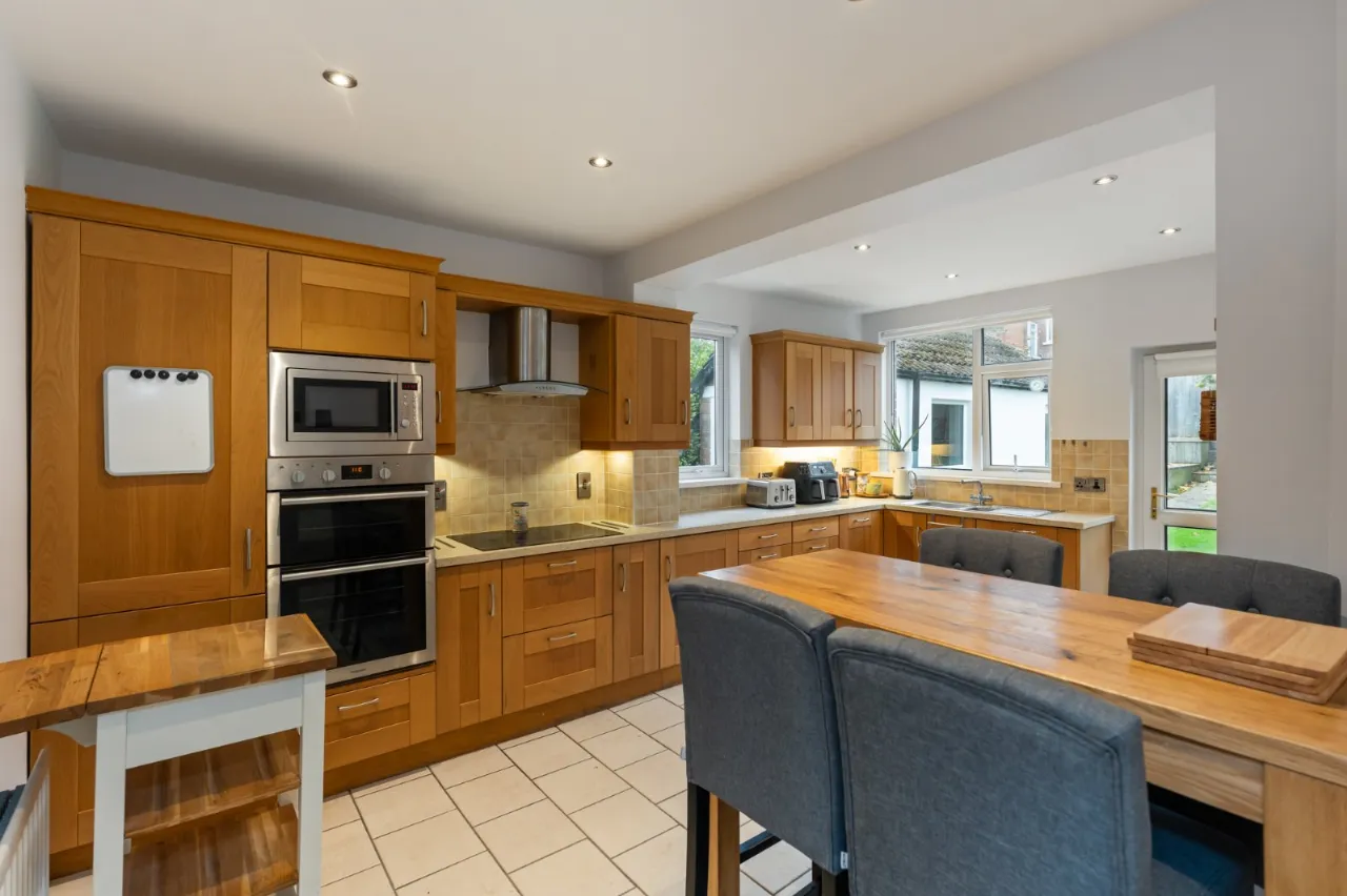 Excellent range of high and low level wooden units, single bowl sink unit with mixer tap and drainer, 4 ring induction hob with overhead extractor hood, inegrated eye level microwave, integrated double oven and grill, integrated dishwasher, integrated fridge and freezer, partly tiled walls, recessed lighting, tiled floor, space for dining, access to rear garden, access to: