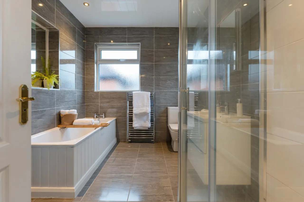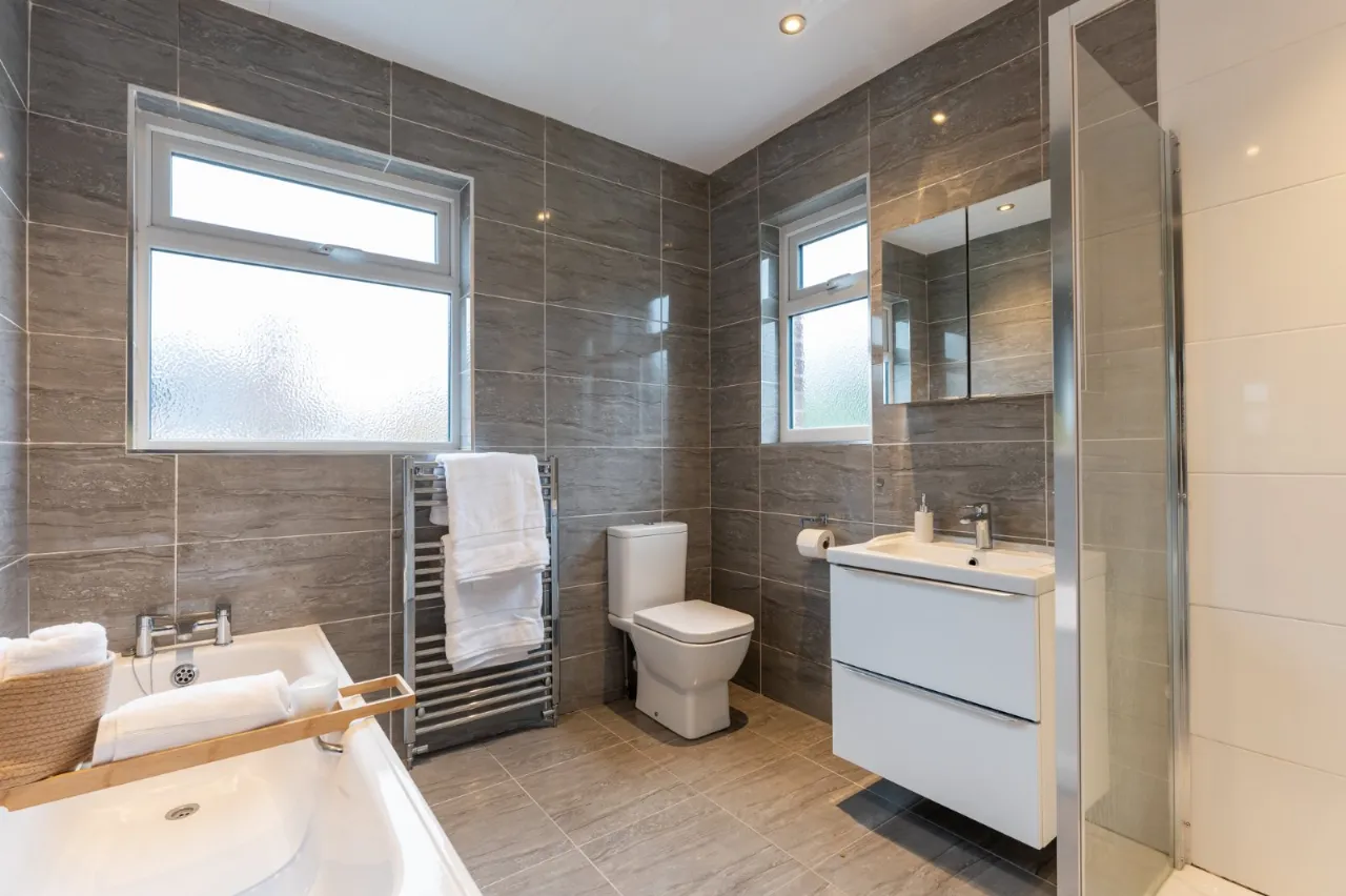 Contemporary bathroom suite comprising of: panelled bath with mixer taps, corner shower unit with shower screen, low flush WC, ceramic bowl sink unit with mixer taps and vanity storage beneath, chrome heated towel radiator, tiled walls and floor, recessed lighting.