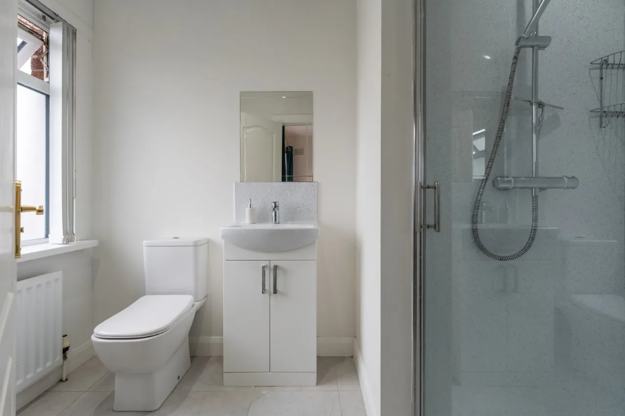Comprising: Enclosed shower unit with shower screen, ceramic bowl sink unit with mixer tap and vanity storage underneath, low flush WC, tiled floor, recessed lighting.