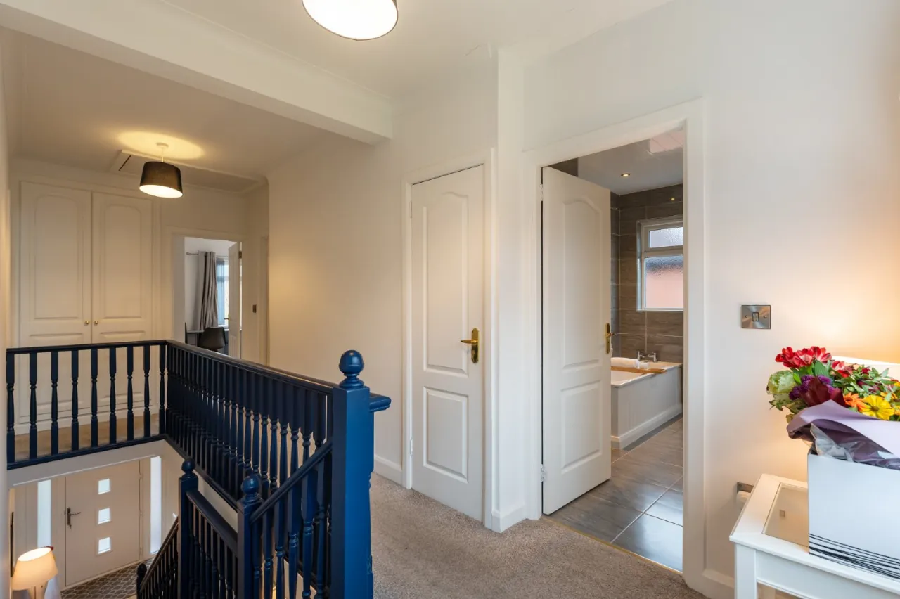 Large, bright, airy landing space, access to partly floored loft via Slingsby ladder, built in storage, built in shelving unit.