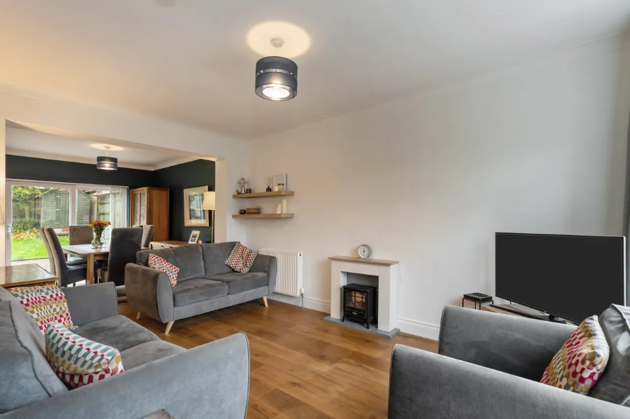 Wooden floor, corniced ceiling, patio doors to rear garden.